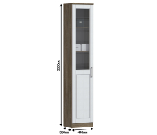 При компактных размерах – ширина 44 см, высота 222 см и глубина 35, это довольно вместительный пенал, который позволит решить вопросы, связанные с хранением памятных вещей. Произведен пенал-витрина из современного и прочного материала. Цвет отделки комбинированный. Корпус выполнен из КДСП в цвете «Дуб Сонома Трюфель». А фасадная поверхность – из МДФ в цвете «Сандал Белый». Также фасадная дверца имеет остекление.
