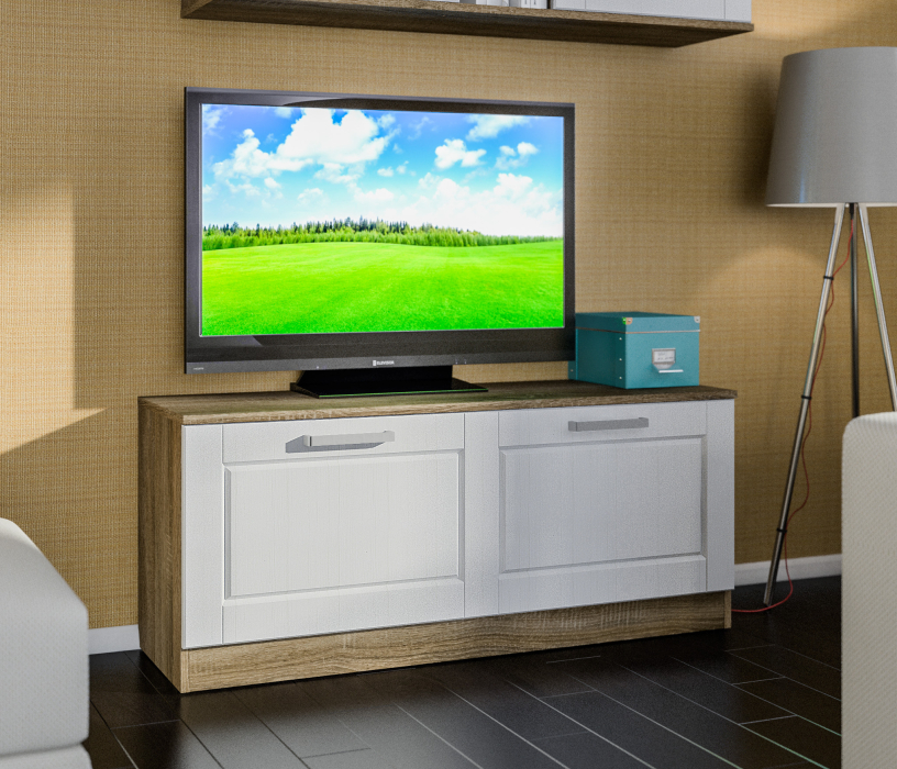Габаритные размеры – ширина 119 см, высота 50 см и глубина 35 см. Визуально тумбу можно разделить на два симметричных отделения. Каждое отделение имеет отдельную дверцу. Корпус выполнен из КДСП в цвете «Дуб Сонома Трюфель». А фасадная поверхность – из МДФ в цвете «Сандал Белый».