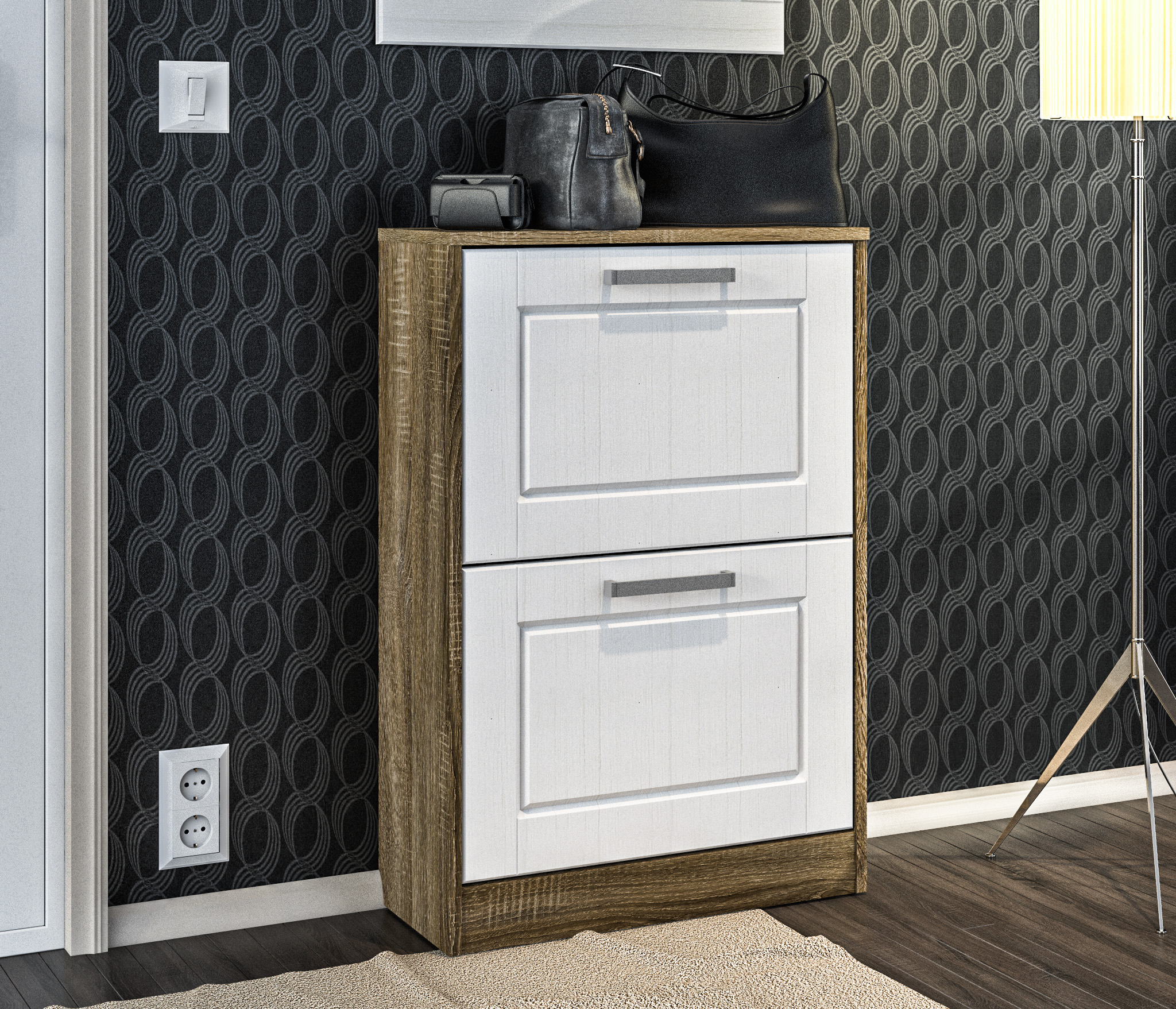 Габаритные размеры – ширина 59 см, высота 87 см и глубина 25 см. Прямо под столешницей расположены две секции для хранения обуви. Корпус тумбы выполнен из КДСП в цвете «Дуб Сонома Трюфель». А фасадная поверхность – из МДФ в цвете «Сандал Белый».