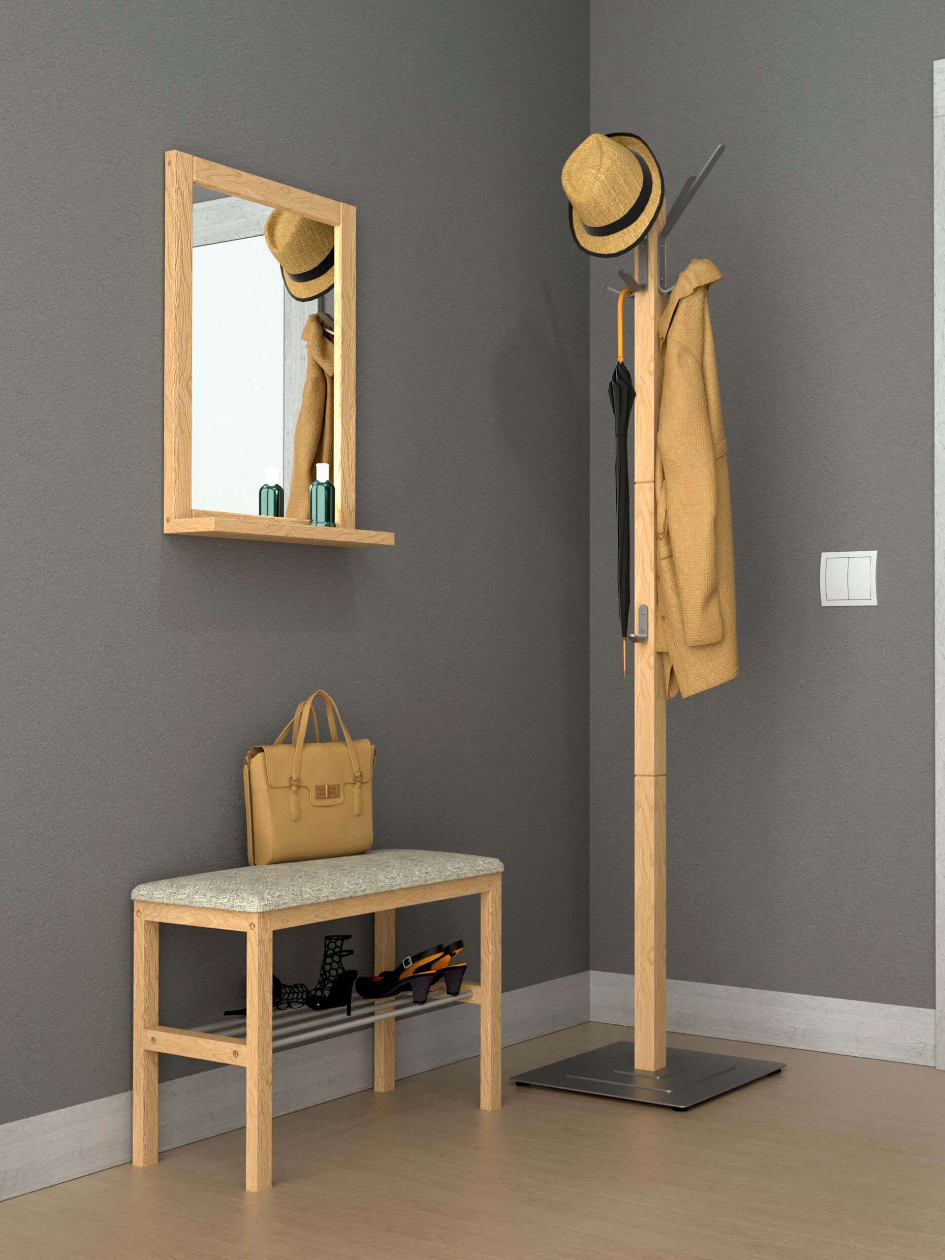 - Стойка вешалки выполнена из массива древесины - береза, брус толщиной 46х46 мм.; крючки - из металла;Деревянные детали могут немного отличаться по оттенку из-за неоднородности структуры дерева.