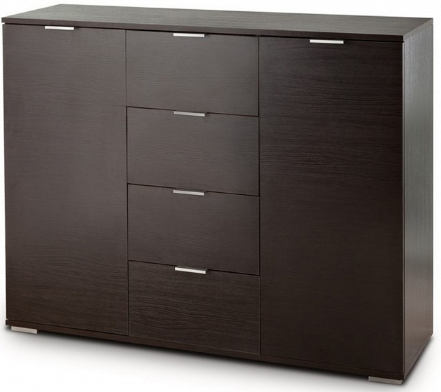 Комод НК-4 с разными вариантами ящиков: четыре выдвижных расположены посередине, по бокам: ящики с распашными дверцами. Этот комод поможет разместить вещи любого размера в удобном порядке.