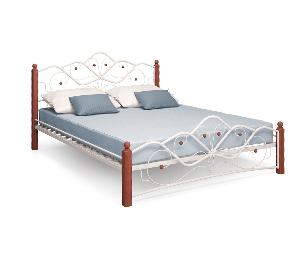 Ножки кровати изготовлены из массива березы, основание - металлическое с березовыми ламелями, спинка и изножье декорированы фигурными металлическими элементами.
