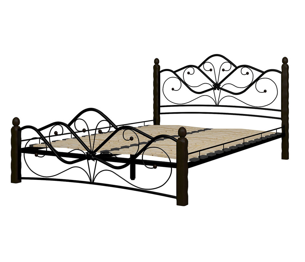 Ножки кровати изготовлены из массива березы, основание - металлическое с березовыми ламелями, спинка и изножье декорированы фигурными металлическими элементами.
