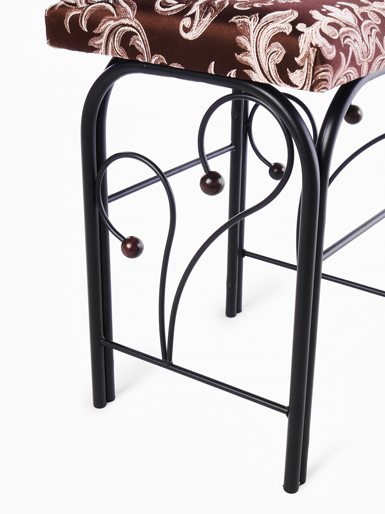 Банкетка на металлическом основании с мягким сиденьем. Ножки декорированы фигурными металлическими элементами с деревянными шариками.