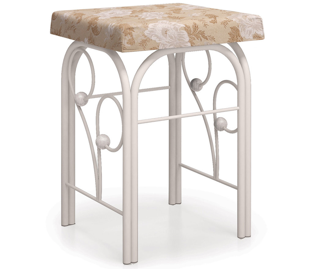 Банкетка на металлическом основании с мягким сиденьем. Ножки декорированы фигурными металлическими элементами с деревянными шариками.
