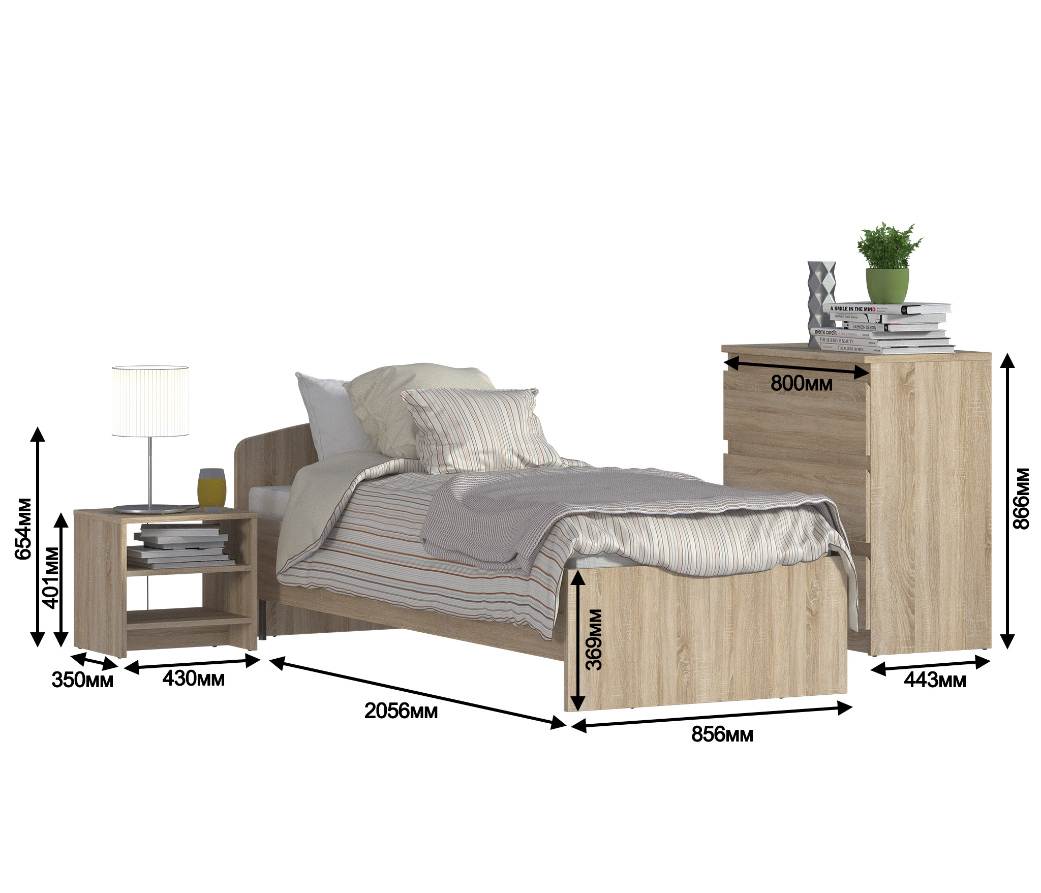 Размеры каждого элемента:br>Кровать - Ширина 85 см, Высота спинки 65 см, Глубина 205 см