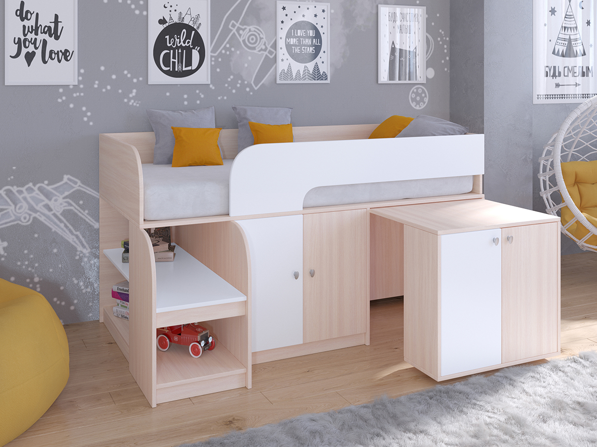 Кровать-чердак Астра 9 превосходно подойдет для детей раннего возраста. Компактная конструкция кровати позволяет сэкономить место в комнате и в то же время хранить массу необходимых вещей. Вместительный шкафчик позволит разместить в своих недрах детскую одежду. А выкатной стол позволит ребенку заниматься разнообразным творчеством. Удобный шкафчик с полочкой, расположенный в ножке стола, позволит аккуратно хранить многочисленные карандаши, фломастеры, краски и другие инструменты для творчества.