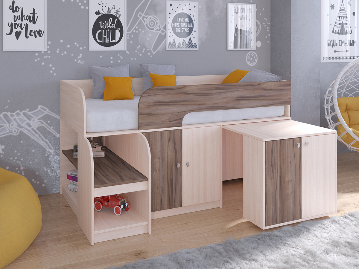 Кровать-чердак Астра 9 превосходно подойдет для детей раннего возраста. Компактная конструкция кровати позволяет сэкономить место в комнате и в то же время хранить массу необходимых вещей. Вместительный шкафчик позволит разместить в своих недрах детскую одежду. А выкатной стол позволит ребенку заниматься разнообразным творчеством. Удобный шкафчик с полочкой, расположенный в ножке стола, позволит аккуратно хранить многочисленные карандаши, фломастеры, краски и другие инструменты для творчества.