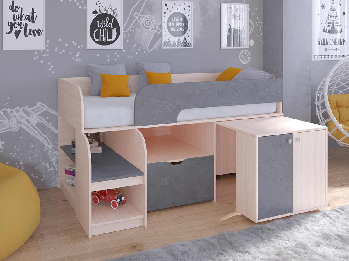Кровать-чердак Астра 9 превосходно подойдет для детей раннего возраста. Компактная конструкция кровати позволяет сэкономить место в комнате и в то же время хранить массу необходимых вещей. На просторной полке можно разместить массу книг и детских принадлежностей. Большой, глубокий ящик позволит хранить огромное количество детских игрушек. А выкатной стол позволит ребенку заниматься разнообразным творчеством. Удобный шкафчик с полочкой, расположенный в ножке стола, позволит аккуратно хранить многочисленные карандаши, фломастеры, краски и другие инструменты для творчества.