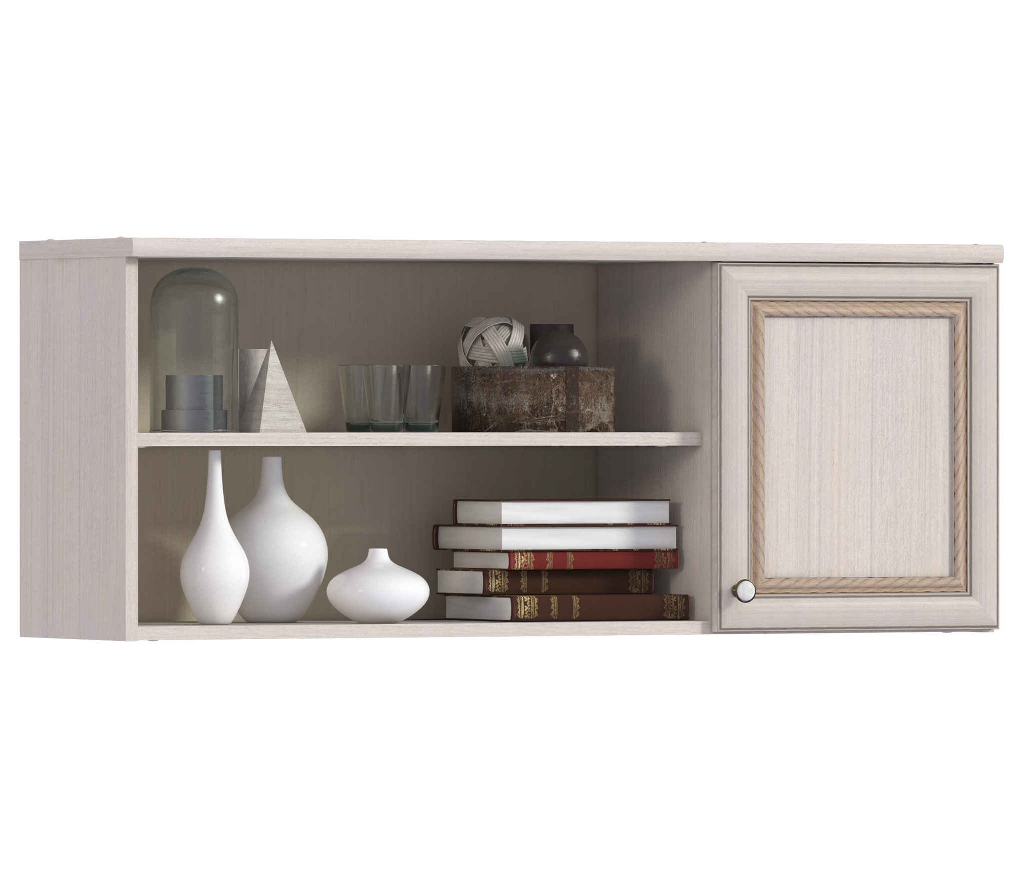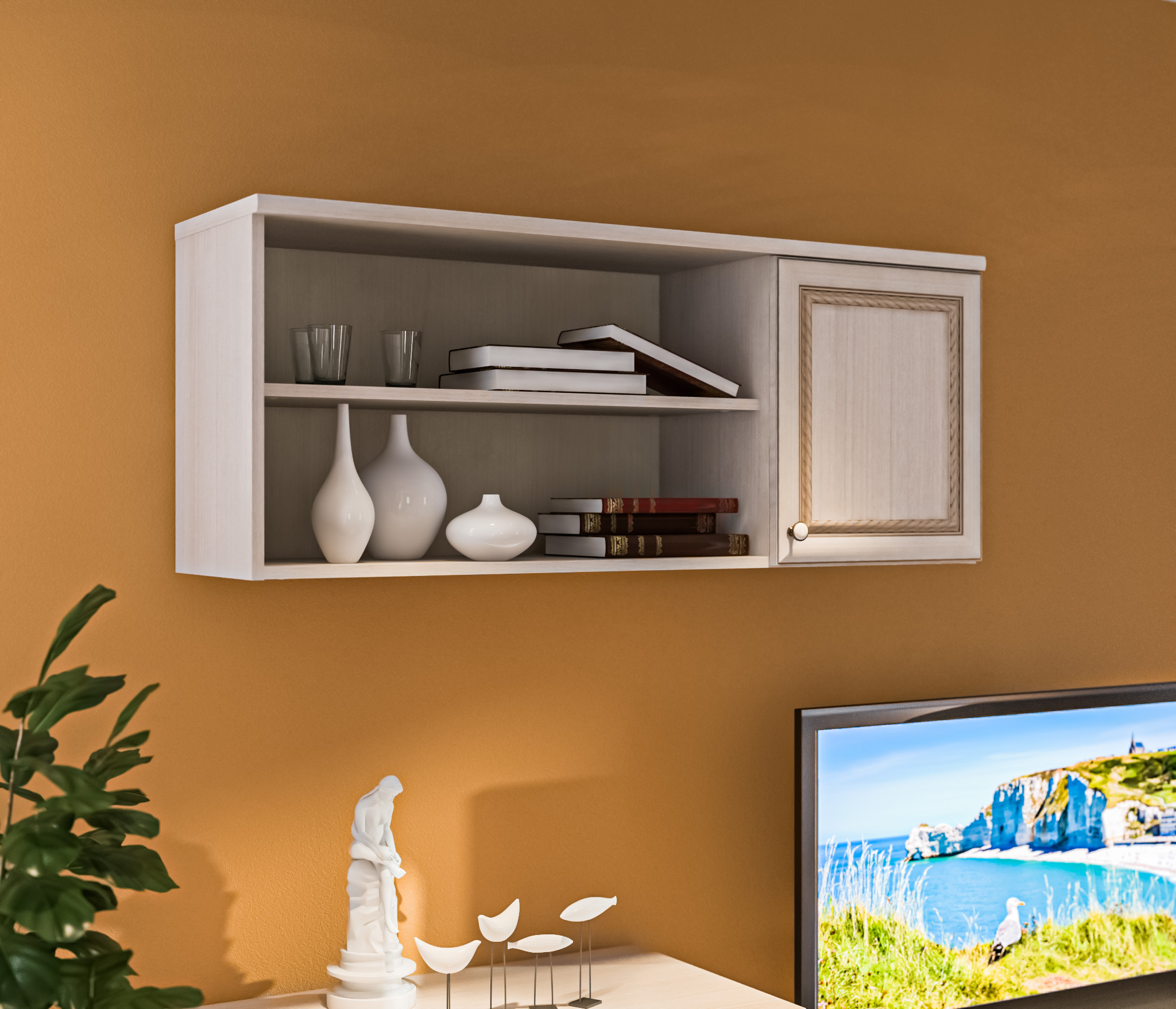 Корпус полки выполнен из современного и прочного КДСП в цвете «Авиньон», фасад - из МДФ. Полка может стать элементом модульной системы Грация, но и может использоваться как отдельный предмет мебели.