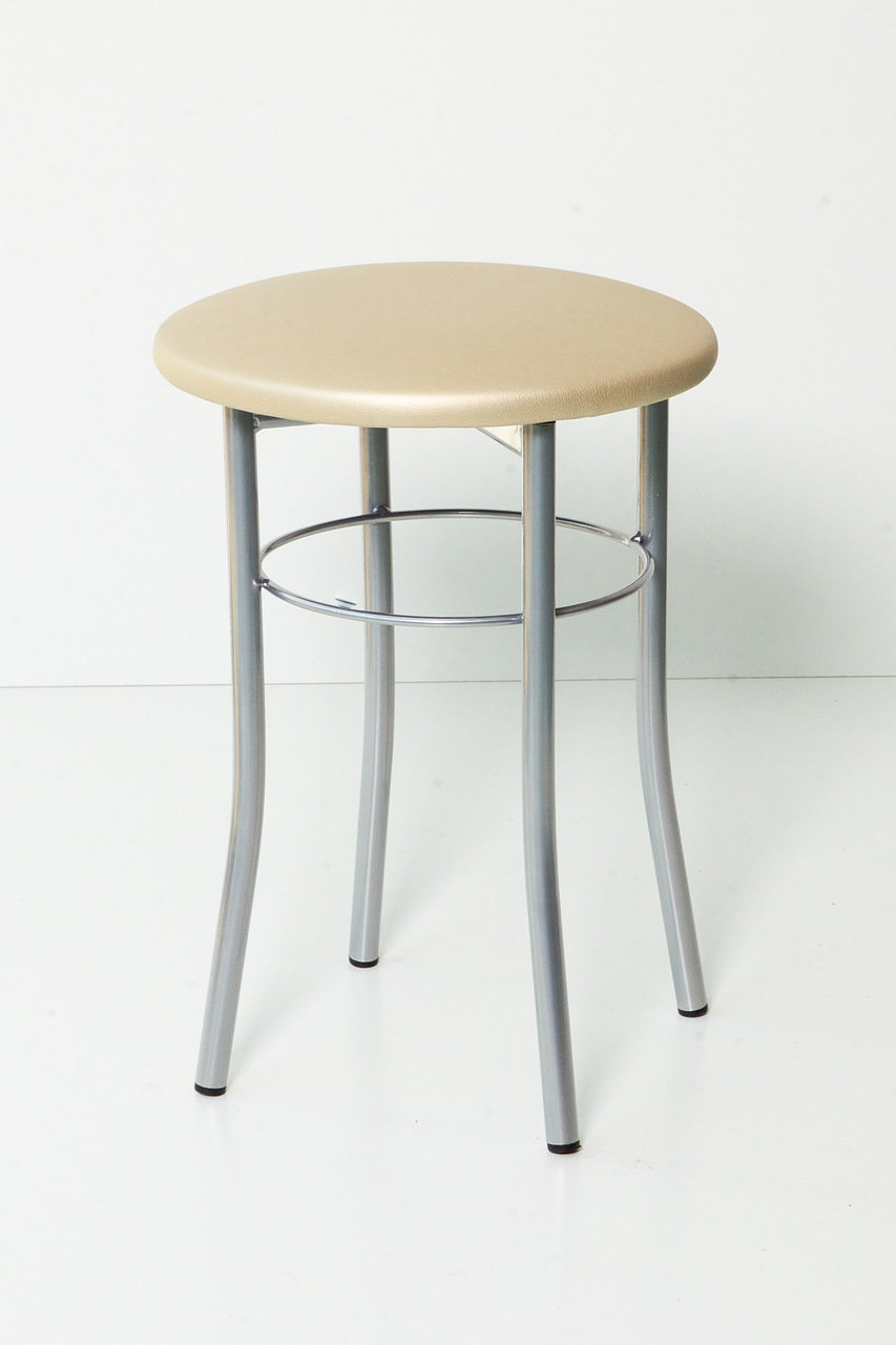 Табурет Экстра - это прочный и удобный табурет на металлическом каркасе. Окрас металлического каркаса - серебро. Обивка сиденья -мягкая бежевая экокожа с перламутровым отттенком. Диаметр трубы 20 мм, толщина трубы 1,2мм. Прочный поверхностный слой окраса, окрас производится полимерным порошком с поледующей полимеризацией. Дополнительная прочность обеспечивается металлическим кольцом, которое приварено к ножкам табурета.