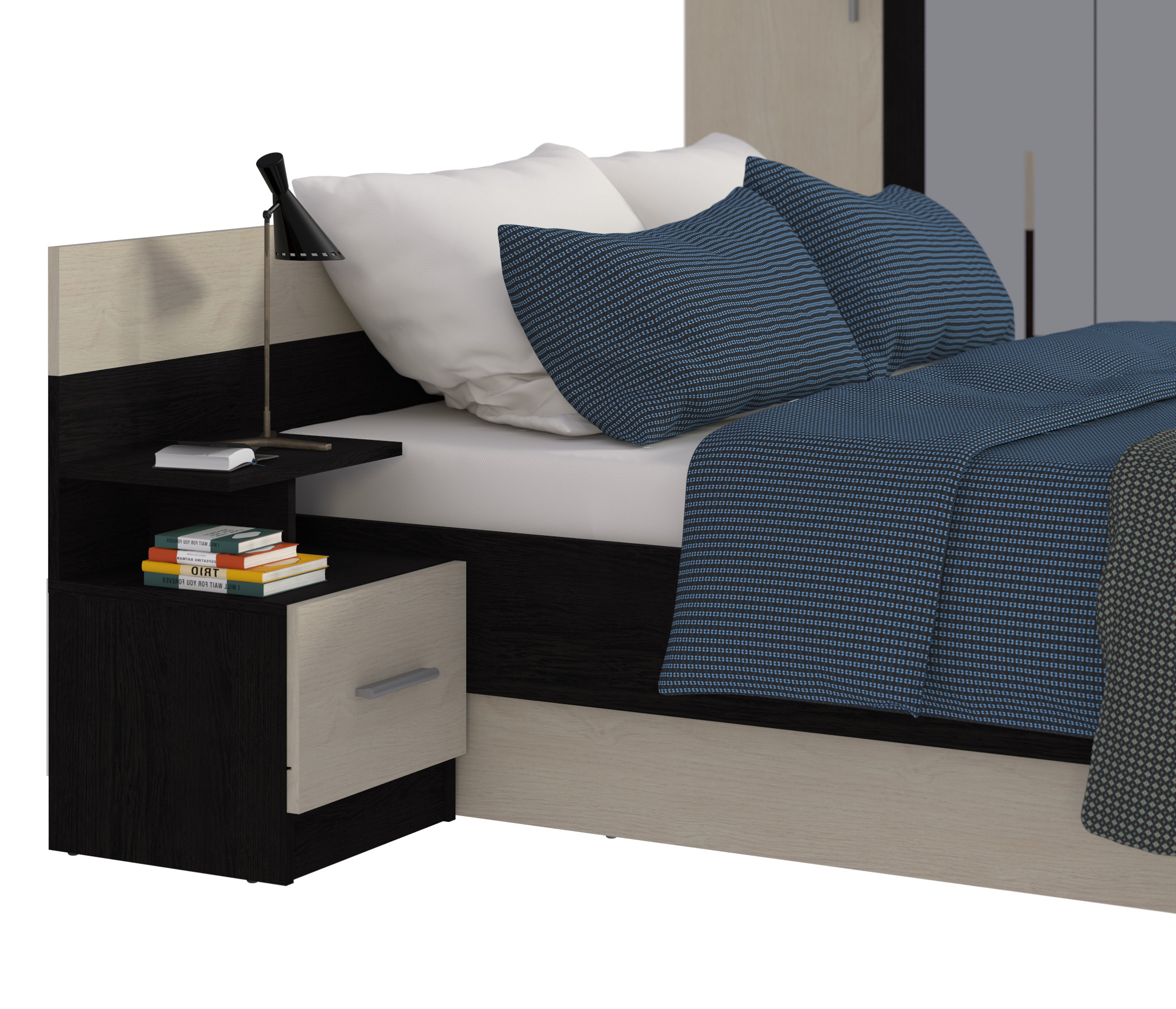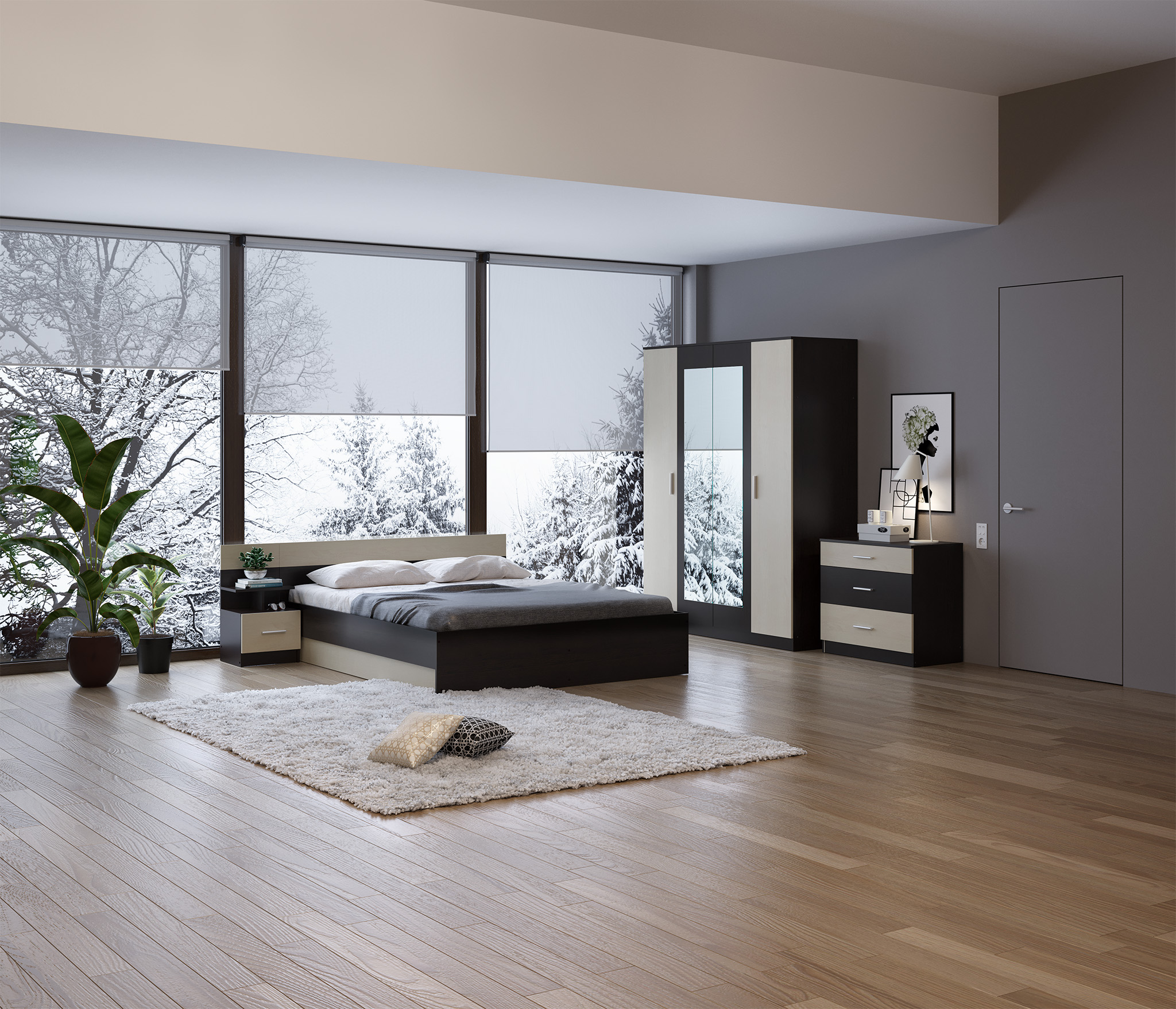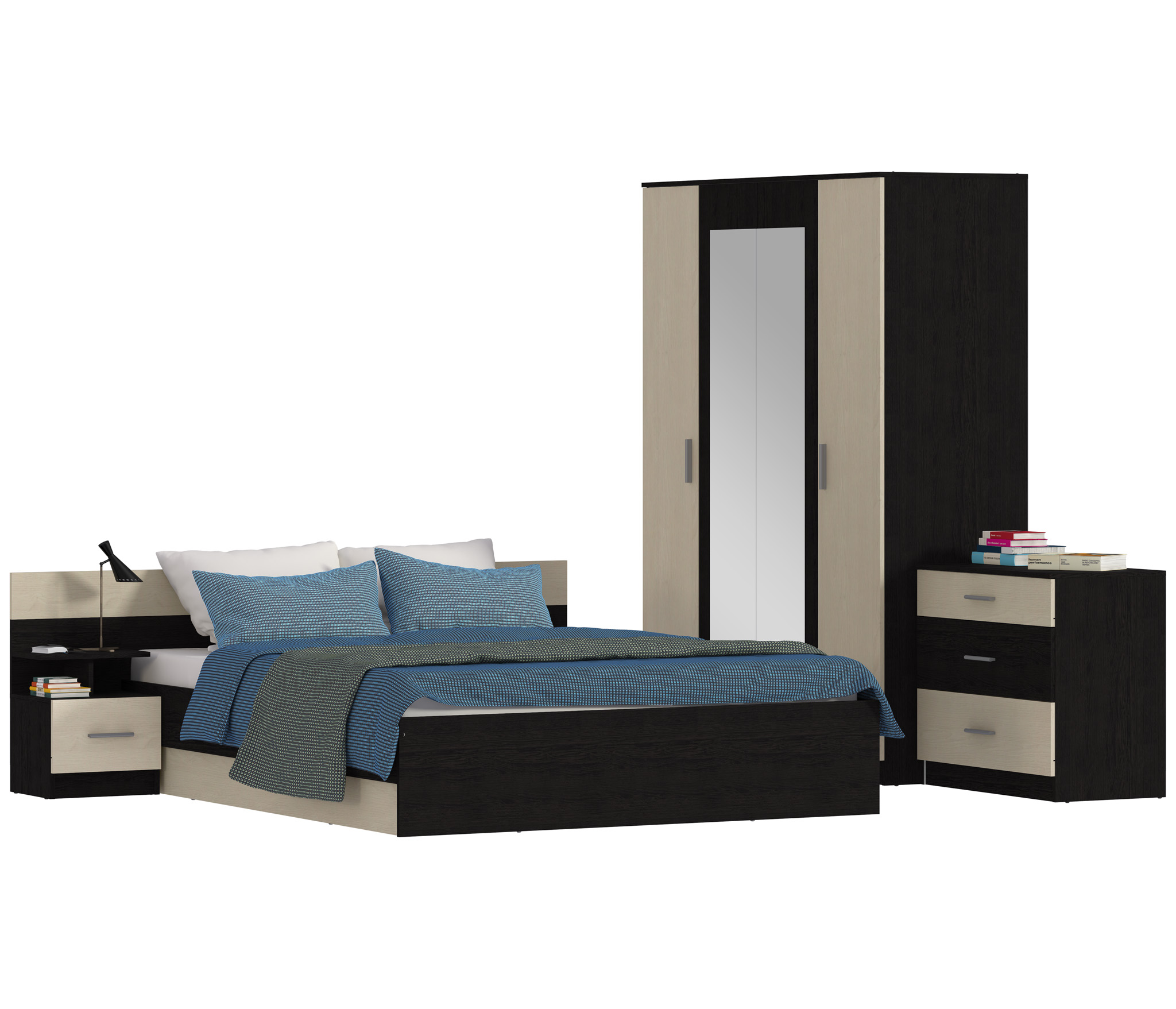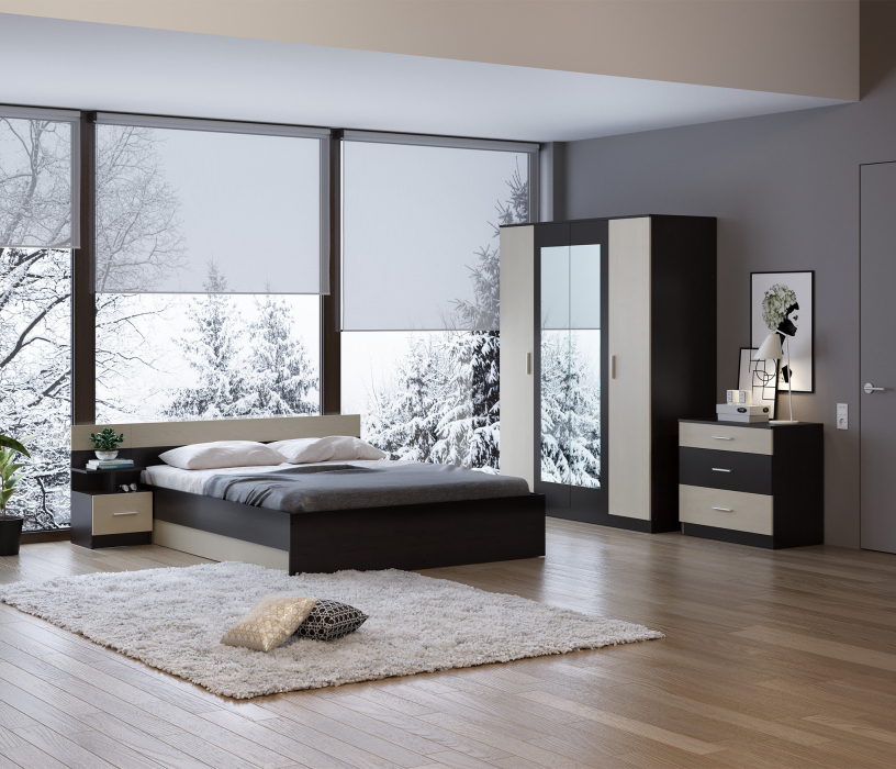 В данный комплект входит: Шкаф 4-х дверный, кровать, комод и одна прикроватная тумба. У кровати стандартное основание из ЛДСП.