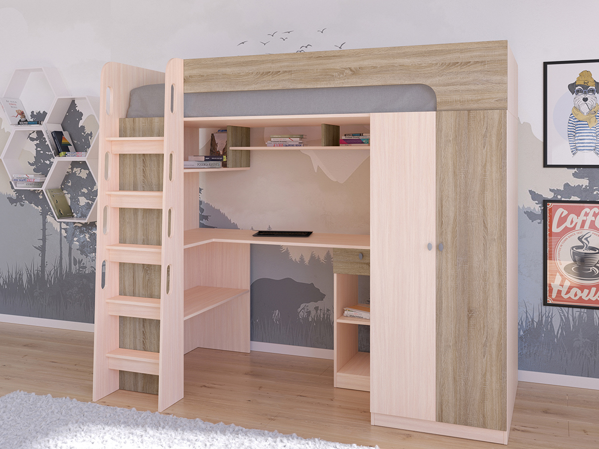 Кровать-чердак Астра 10 порадует Вас практичностью и удобством. Множество полочек позволят без труда разместить книги, поделки, тетради и прочие предметы творчества и учебы. Удобная угловая столешница не даст устать при выполнении домашнего задания или творческой работы. Продуманная конструкция ступеней лестницы позволит безопасно забраться на спальное место. А вместительный шкаф спрячет в своих недрах одежду ребенка.