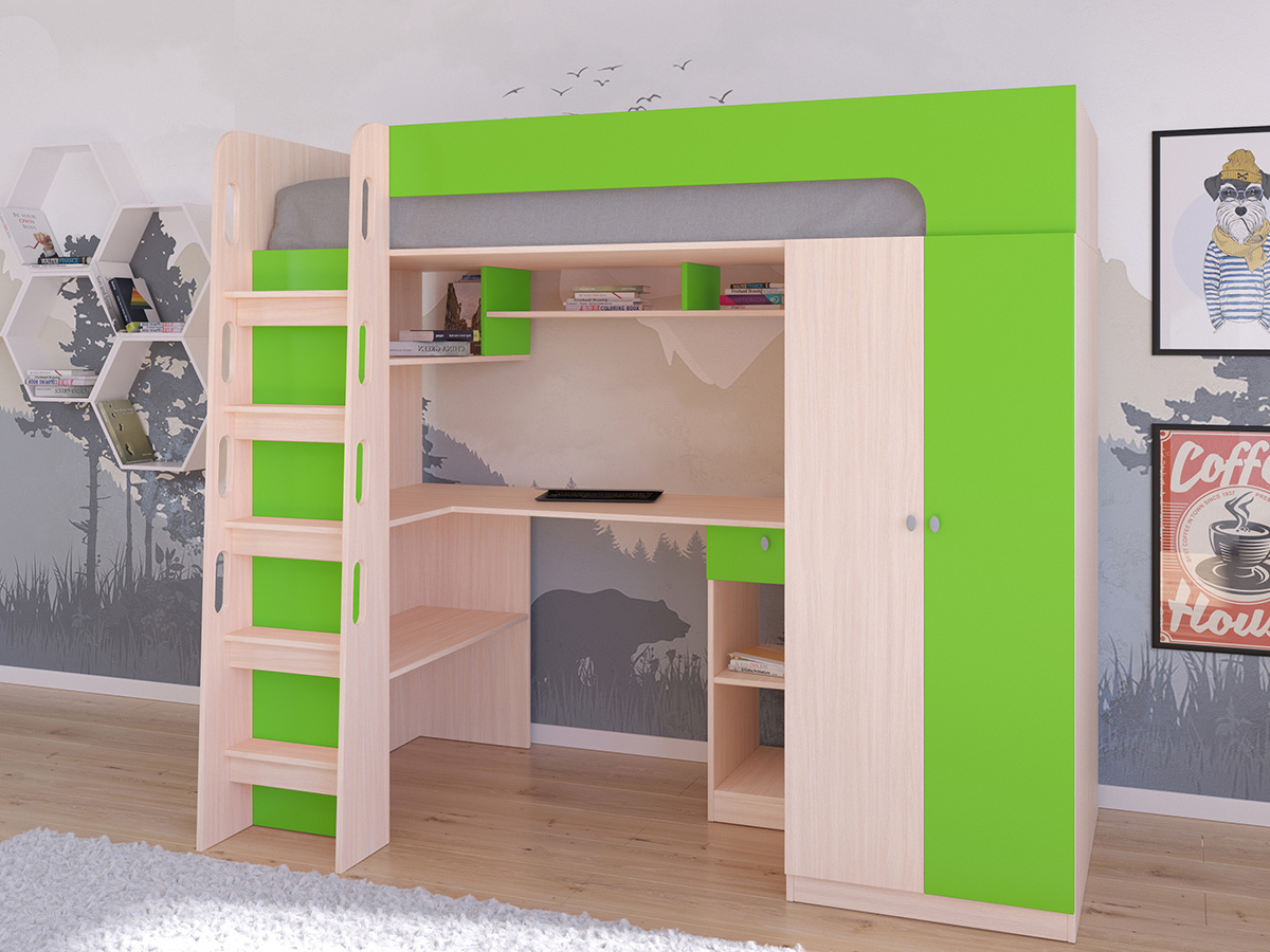 Кровать-чердак Астра 10 Дуб молочный (Салатовый)