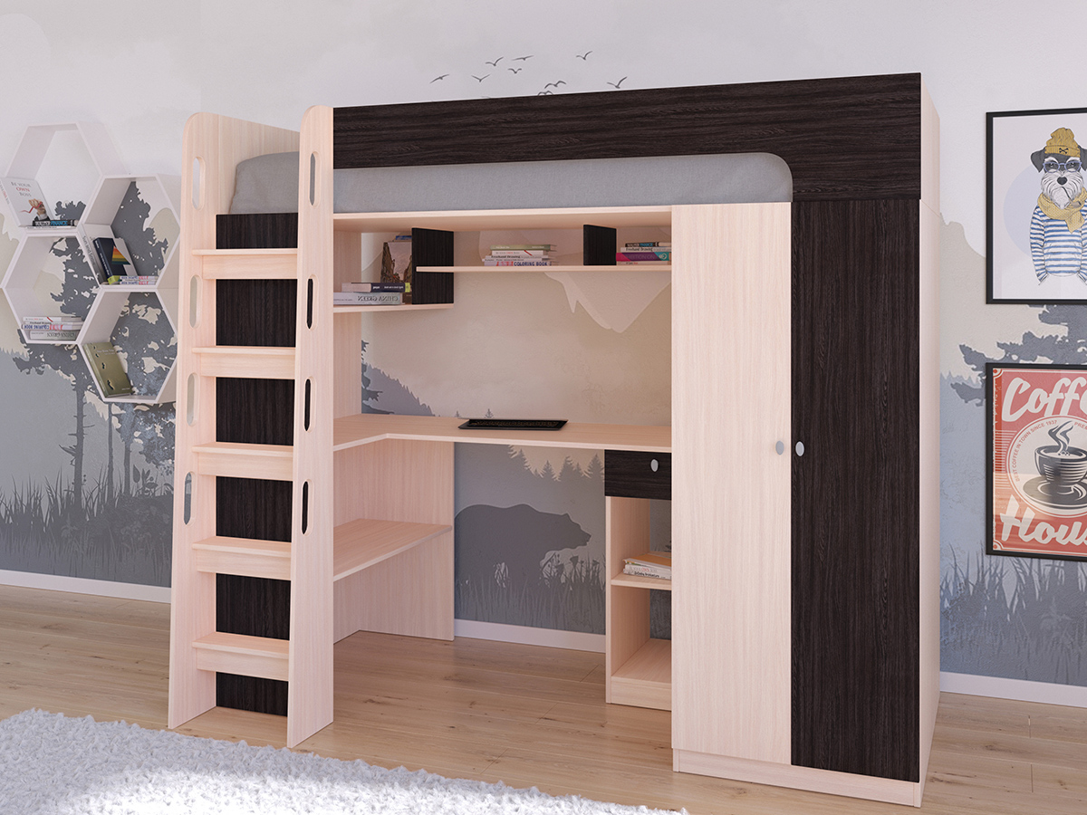 Кровать-чердак Астра 10 порадует Вас практичностью и удобством. Множество полочек позволят без труда разместить книги, поделки, тетради и прочие предметы творчества и учебы. Удобная угловая столешница не даст устать при выполнении домашнего задания или творческой работы. Продуманная конструкция ступеней лестницы позволит безопасно забраться на спальное место. А вместительный шкаф спрячет в своих недрах одежду ребенка.