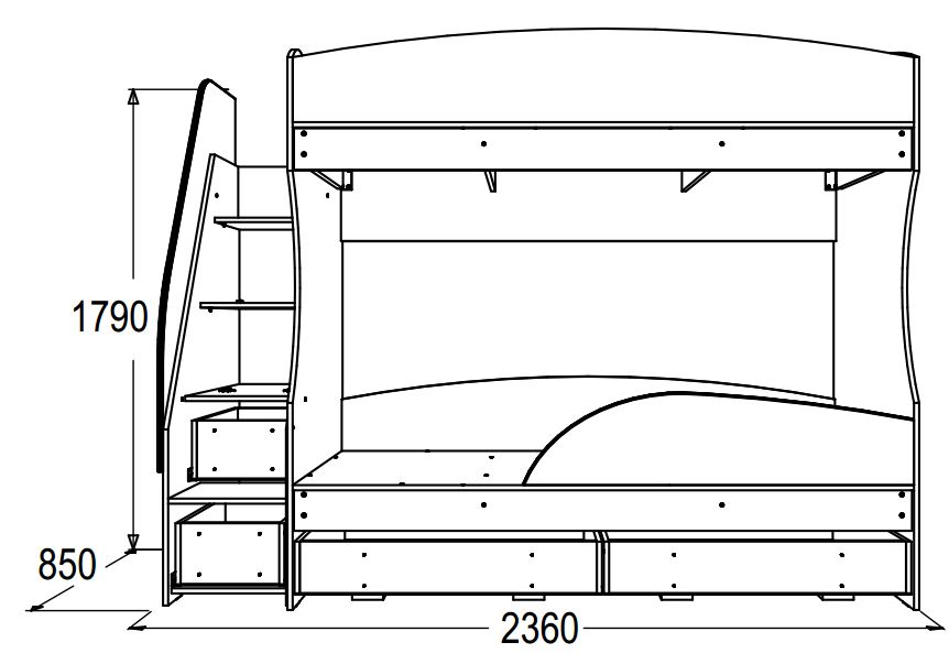 Детская двухъярусная кровать Омега 15 с бортиками: большая современная кровать, комплектуется лестницей-шкафом с ящиками. Плавные линии кровати это не только удачное дизайнерское решение, но и улучшает травмобезопасность кровати. Под кроватью два больших ящика. Матрасы приобретаются отдельно.