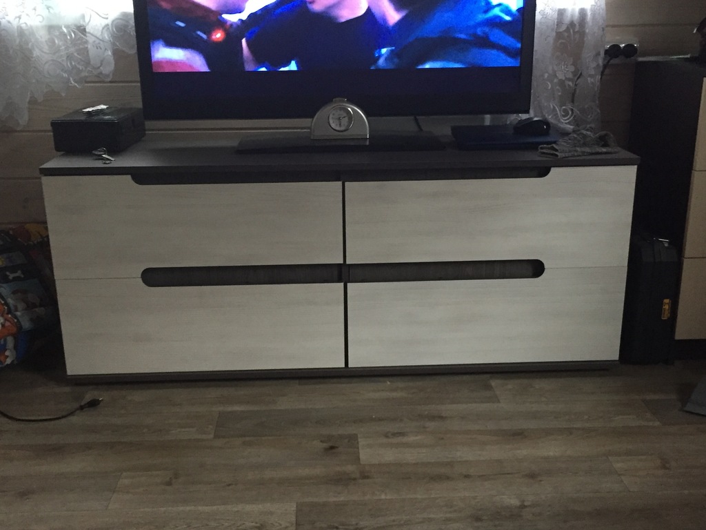 Широкая ТВ-тумба Александра 26 позволит с комфортом и удобством разметить телевизор практически любой диагонали. Модель оснащена двумя секциями, каждая из которых имеет по две полочки, благодаря чему у вас не возникнет проблем с хранением сопутствующей техники и ТВ-аксессуаров, а контрастное сочетание темного корпуса в цвете Ясень анкор темный и светлых фасадов Ясень анкор светлый позволит визуально расширить пространство комнаты, придав ему воздушности.