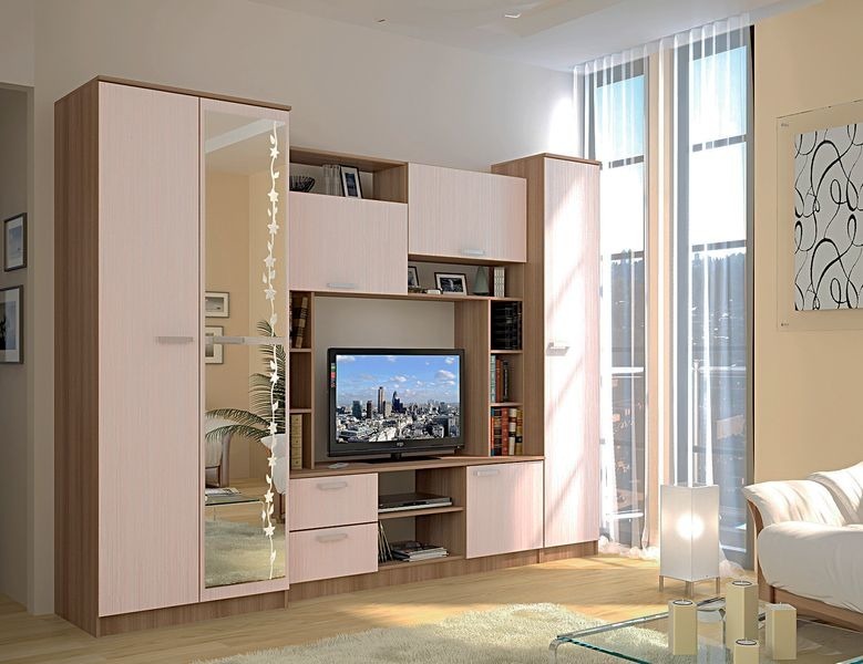 Отличительная особенность: Зеркальная дверь шкафа с гравировкой. Стенка исполнена в стиле модерн, оптимальное решение для любой квартиры по функционалу и визуальной составляющей. Центральная ниша позволяет вместить любой современный телефизор. Выдвижные секции имеют плавный ход. Отличное соотношение цена-качество.