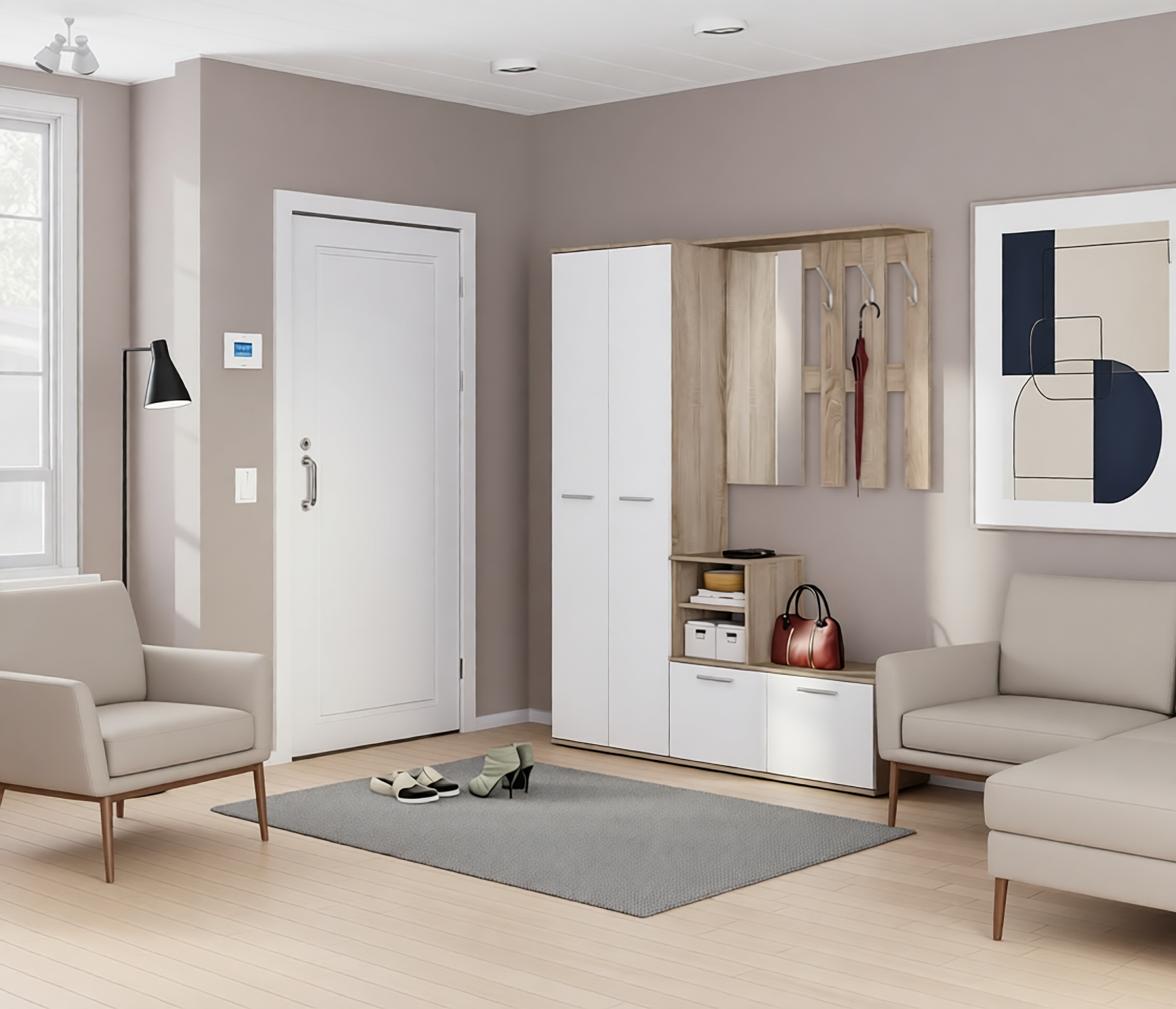 Выполнен шкаф из современного и качественного материала КДСП. Внешняя отделка комбинированная – корпус в цвете «Дуб Сонома», фасады чисто белые.