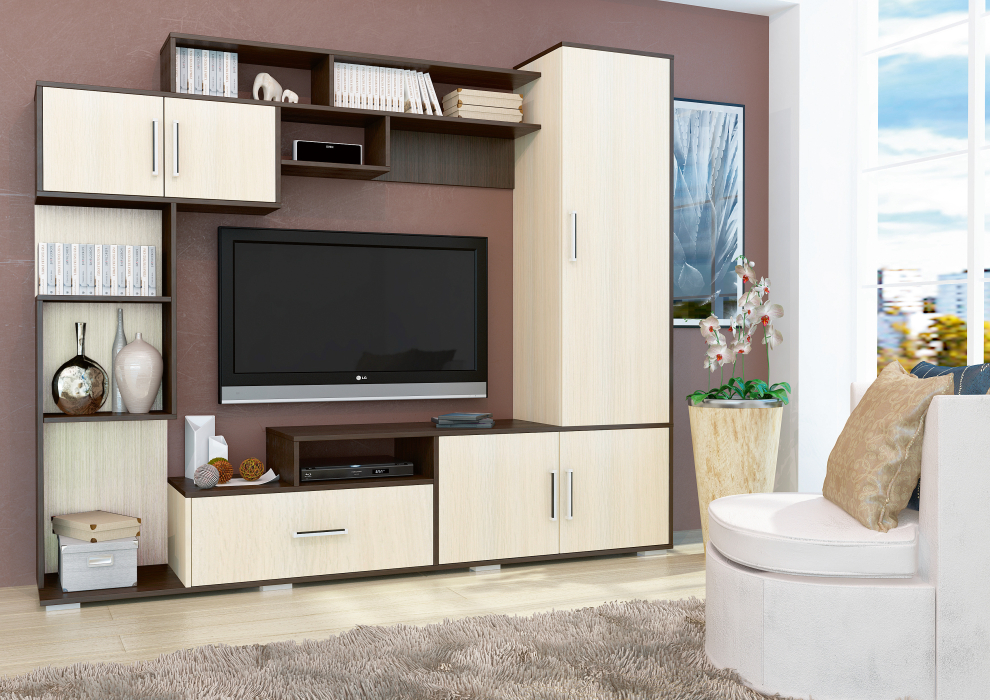 Супер цена! Мини стенка с большой вместимостью для книг, посуды и небольших предметов быта.Комбинированное цветовое исполнение. Размер под ТВ 1255 х 718 мм.
