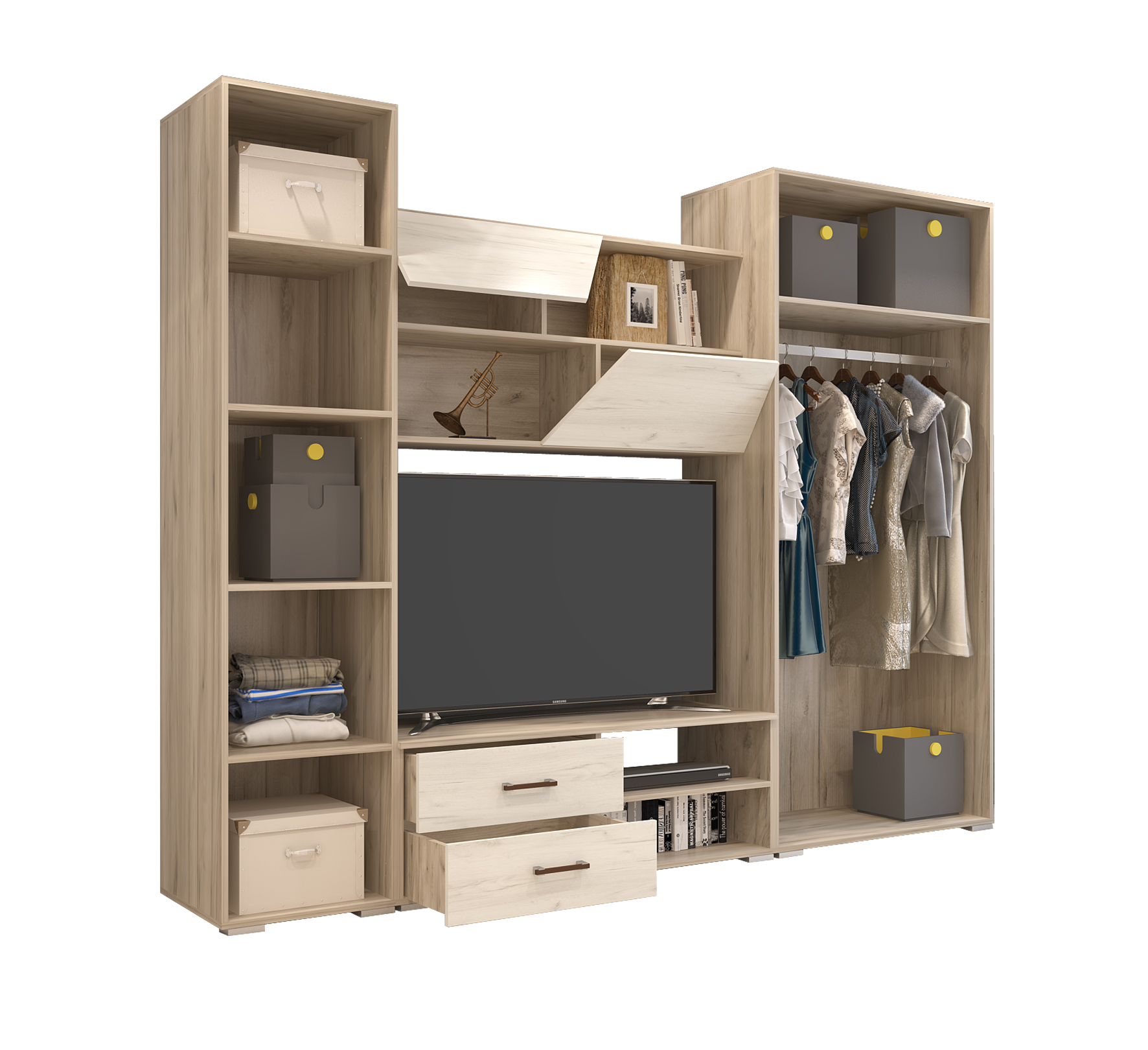 Стенка для гостиной или в детскую комнату. Вместительная, удобная. Комбинированный фасад с горизонтальной текстурой. Шкаф платяной. Размер под ТВ 1200 х 773 мм.