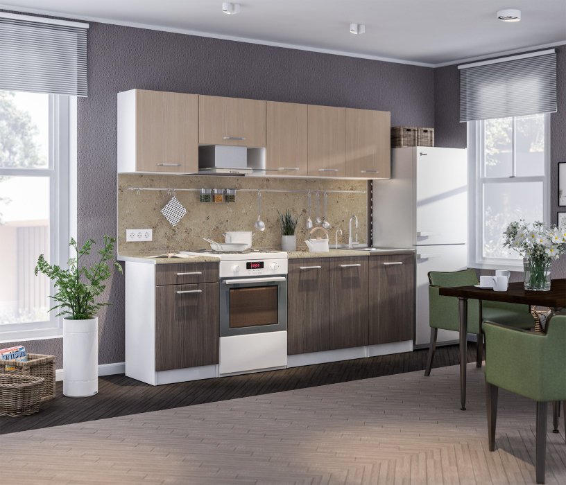 Отличное интерьерное решение для тех, кому не нужно ничего лишнего. Самые необходимые элементы, удачное расположение, удобные ручки, приятные цвета, функциональность и доступность – именно за это кухонный гарнитур уже полюбили наши покупатели. Он выполнен из высококачественного ЛДСП, имитирующего структуру и фактуру натурального дерева. Ручки - пластик, алюминиевый матовый.