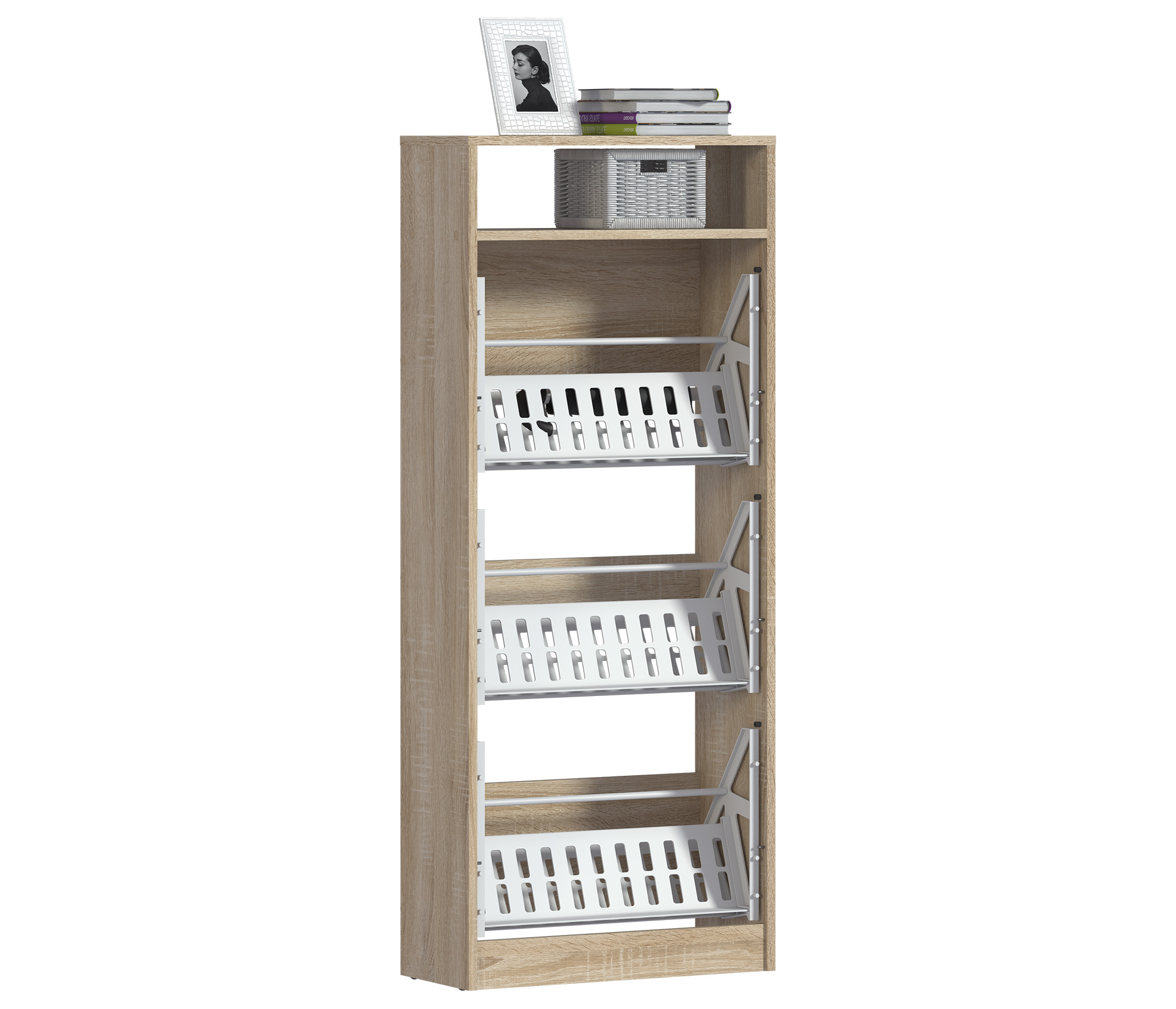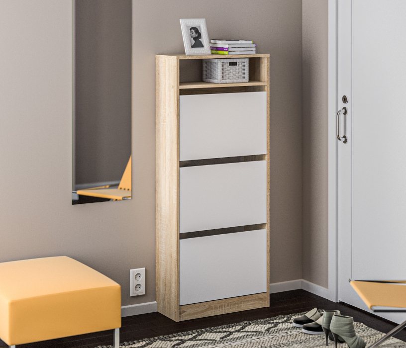 Габаритные размеры – ширина 59 см, высота 142 см и глубина 25 см. Обувница очень вместительная: имеет открытую полочку для хранения мелочей и три отделения, каждое из которых оснащено специальными стойками для хранения обуви. Отсутствие ручек и строгие геометрические формы позволяют вписать обувницу в любой интерьер. Тумба произведена из экологичного прочного КДСП, устойчивого к мелким механическим повреждениям. Отделка комбинированная – корпус в цвете «Дуб Сонома», фасадные поверхности чисто белые.