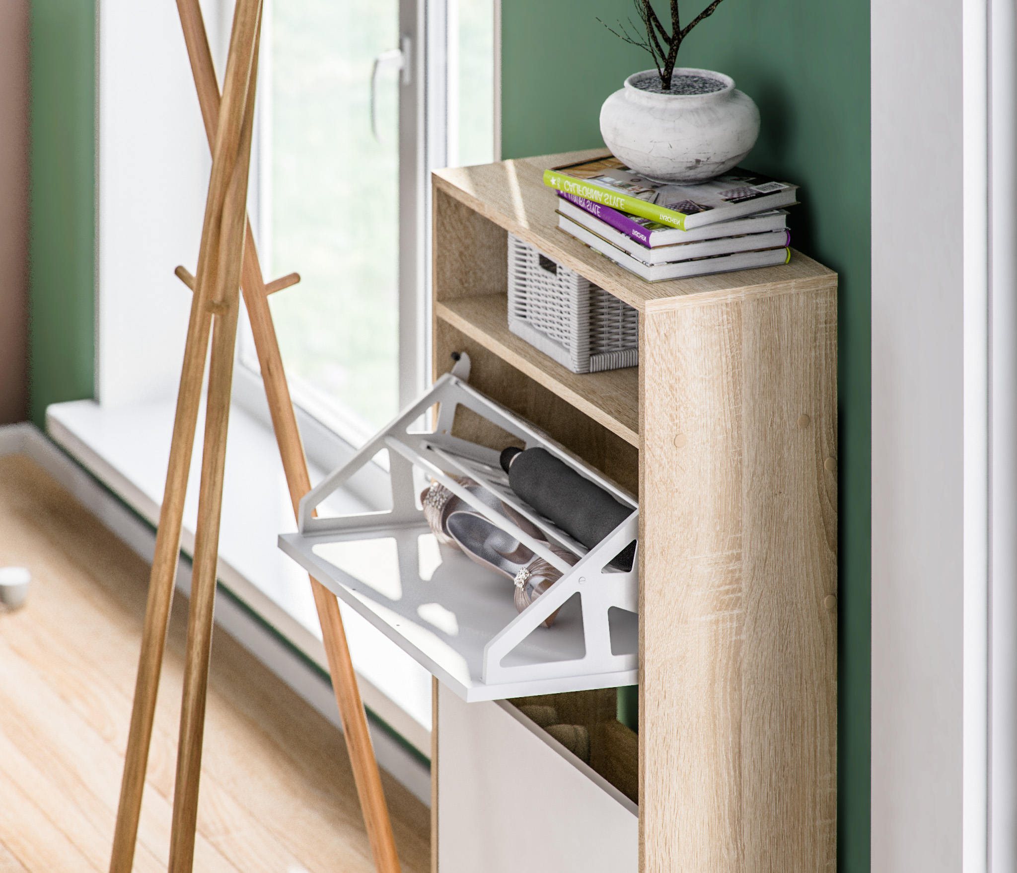 Отличная обувница. Можно поставить высокие ботинки. И удобная высота. Выполняет ещё роль столика в прихожей.