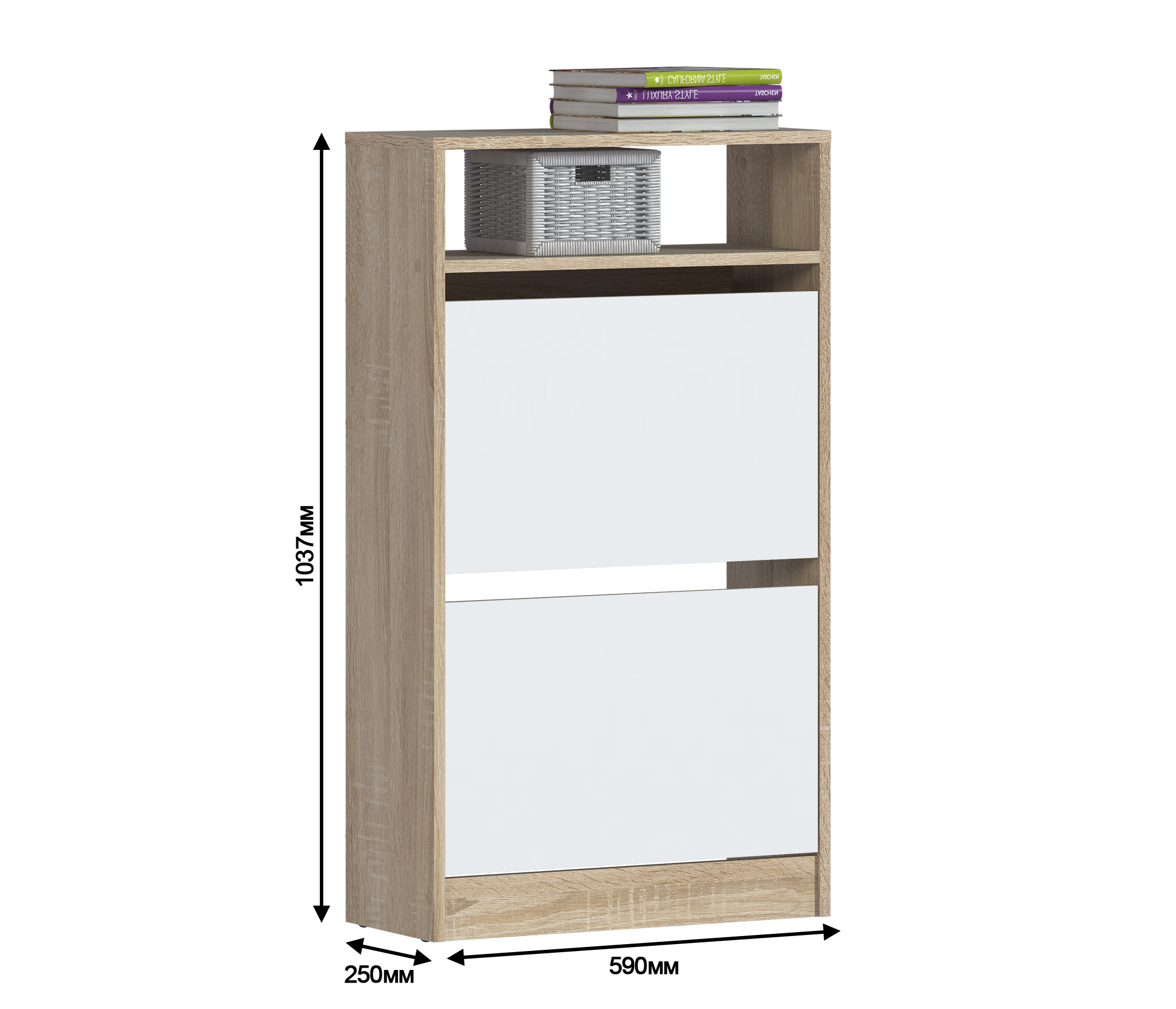 Габаритные размеры – ширина 59 см, высота 103 см и глубина 25 см. Обувница очень вместительная: имеет открытую полочку для хранения мелочей и два отделения, каждое из которых оснащено специальными стойками для хранения обуви. Отсутствие ручек и строгие геометрические формы позволяют вписать обувницу в любой интерьер.