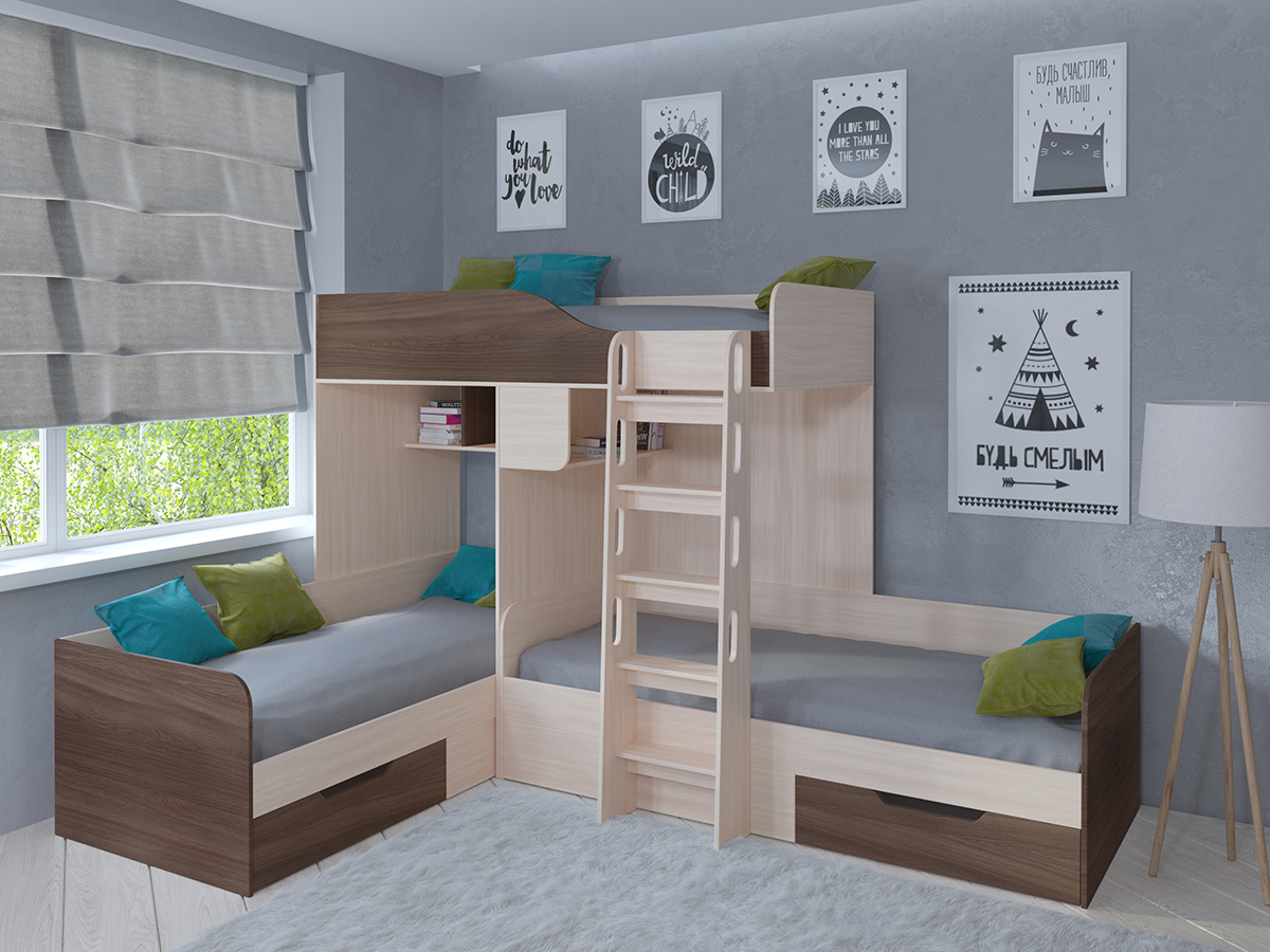 Двухъярусная кровать Трио является субкомпактным вариантом размещения сразу трех детей. За счет углового исполнения она позволит сэкономить полезное пространство в комнате. Но относительно компактные размеры не сказались на функционале - кровать обладает тремя полноценными спальными местами, а так же полочками и ящиками.