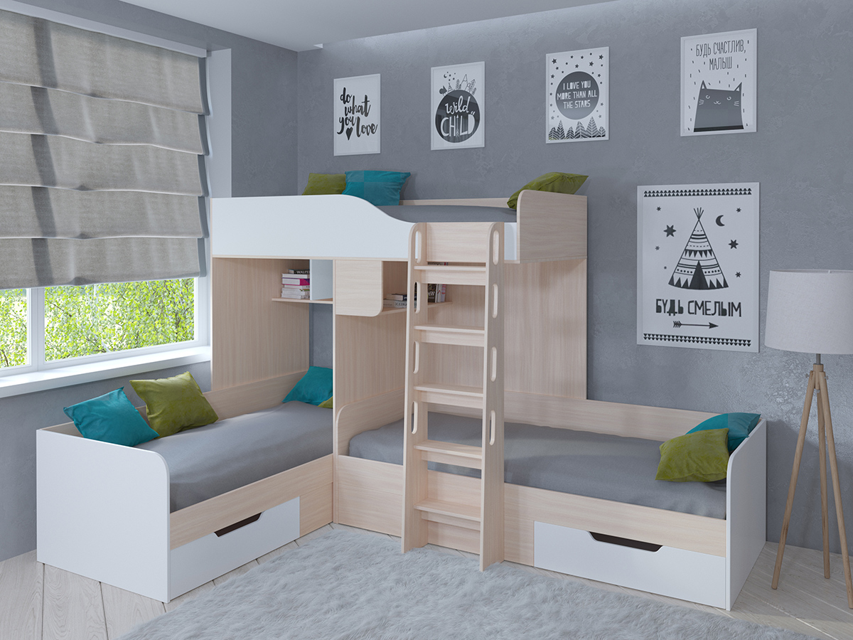 Двухъярусная кровать Трио является субкомпактным вариантом размещения сразу трех детей. За счет углового исполнения она позволит сэкономить полезное пространство в комнате. Но относительно компактные размеры не сказались на функционале - кровать обладает тремя полноценными спальными местами, а так же полочками и ящиками.