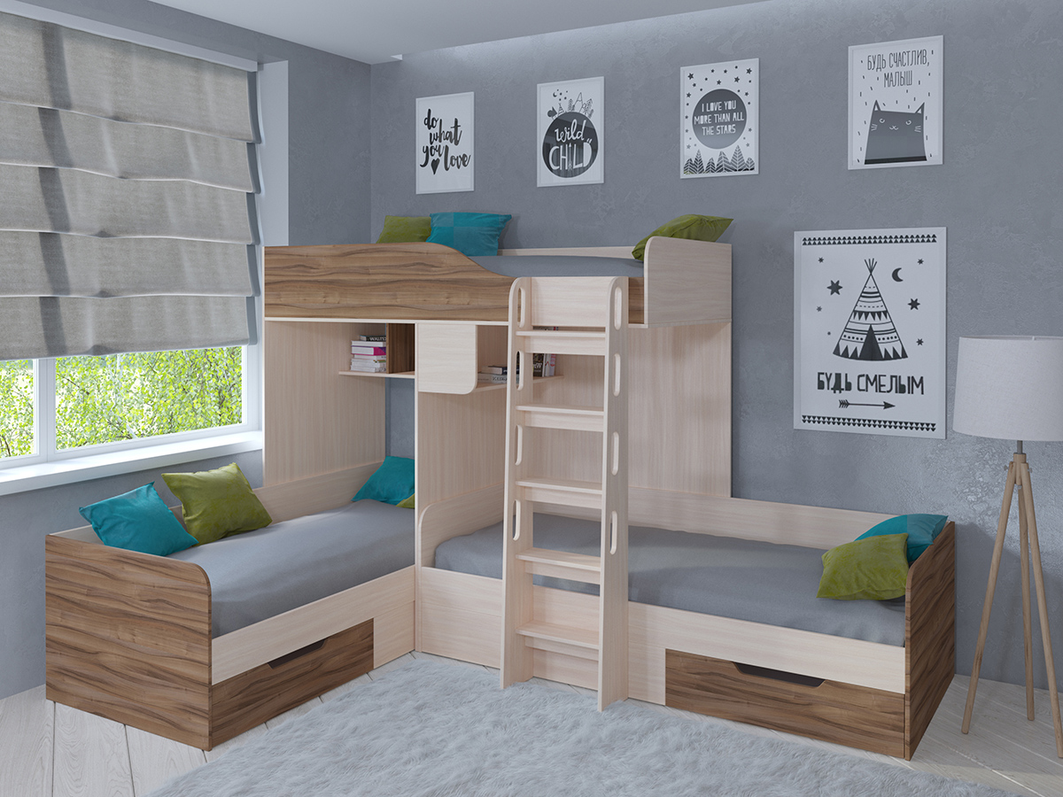 Двухъярусная кровать Трио является субкомпактным вариантом размещения сразу трех детей. За счет углового исполнения она позволит сэкономить полезное пространство в комнате. Но относительно компактные размеры не сказались на функционале - кровать обладает тремя полноценными спальными местами, а так же полочками и ящиками.