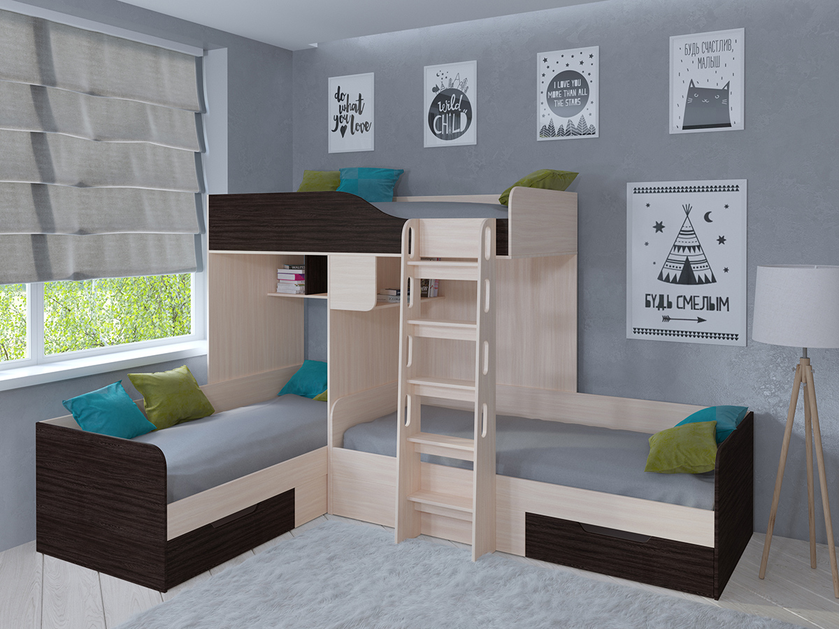 Двухъярусная кровать Трио является субкомпактным вариантом размещения сразу трех детей. За счет углового исполнения она позволит сэкономить полезное пространство в комнате. Но относительно компактные размеры не сказались на функционале - кровать обладает тремя полноценными спальными местами, а так же полочками и ящиками.