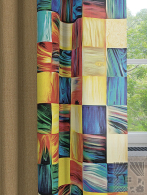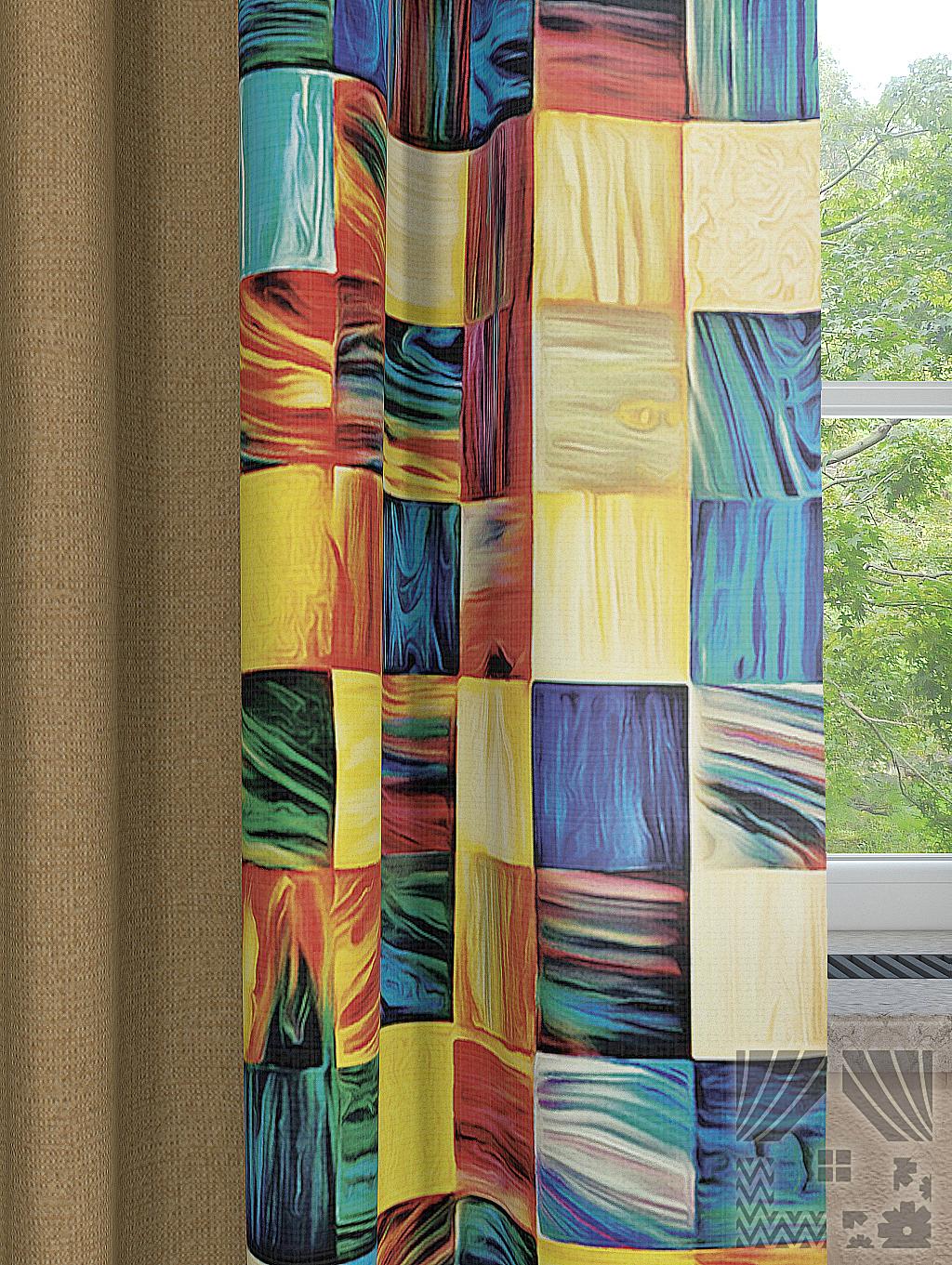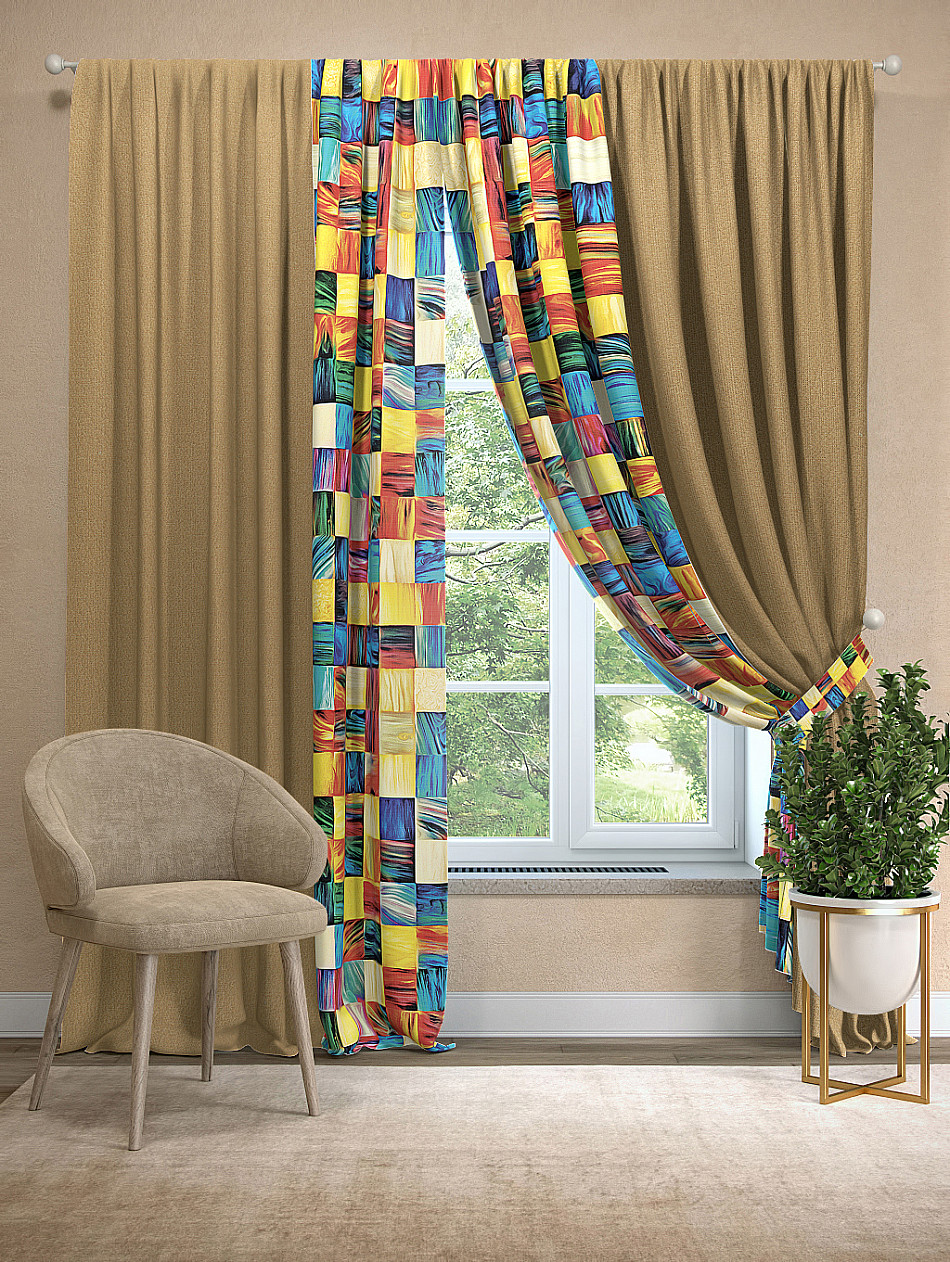 Портьеры 2 шт и 2 подхвата. Плотная основа оформлена отделкой с геометрическим рисунком. Размеры одного полотна: ширина 210 см, высота 260 см. Крепление к карнизу: кулиска, шторная лента (крючки). Материал: 100% — полиэстер.