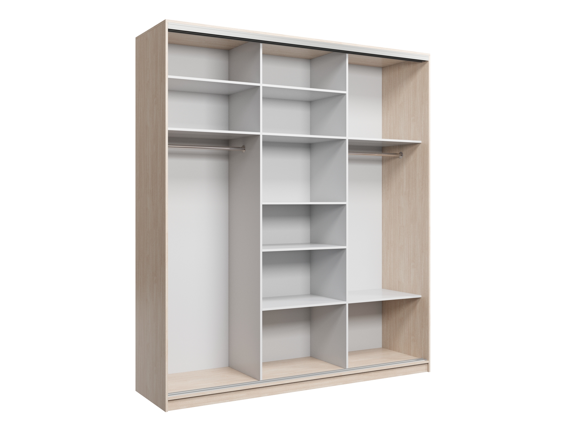 Шкаф купе Айсберг является одной из самых продаваемых моделей. Внутреннее пространство, включает в себя большое количество разных полок и отделение с штангой для вешалок. Модель выполнена из качественного ЛДСП толщиной 16 мм. а современная фурнитура, придает абсолютно тихий ход дверям.