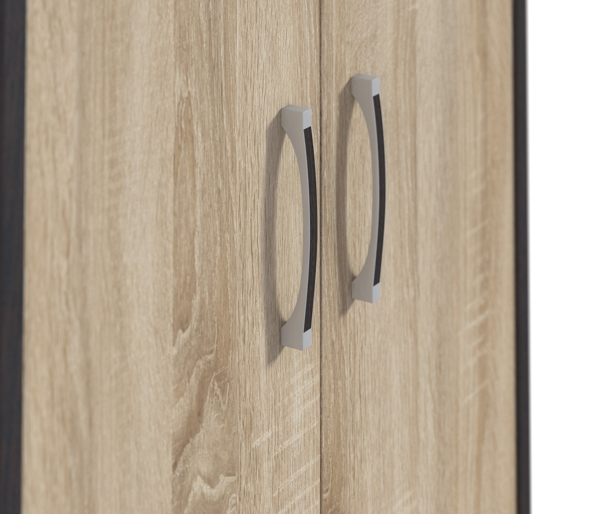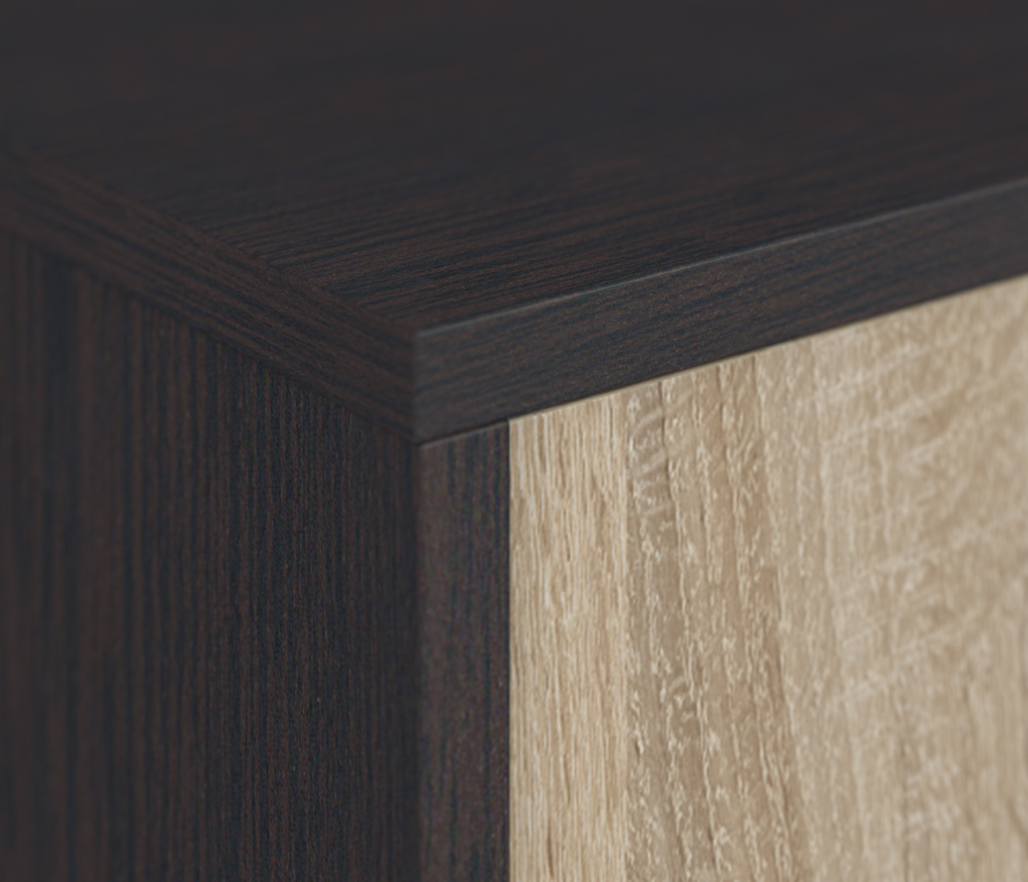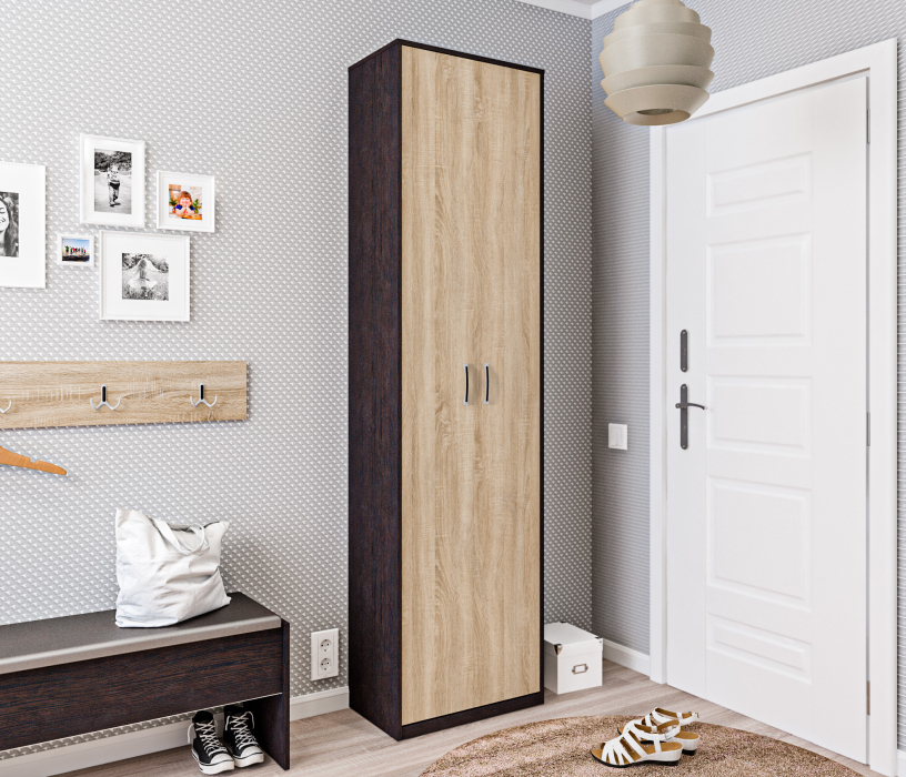 Корпус шкафа выполнен из прочного материала КДСП. Фасадные поверхности облицованы пленкой цвета «Дуб Сонома», корпус облицован декоративной пленкой в оттенке «Венге». Шкаф рекомендуется дополнить элементами модульной коллекции Афина.
