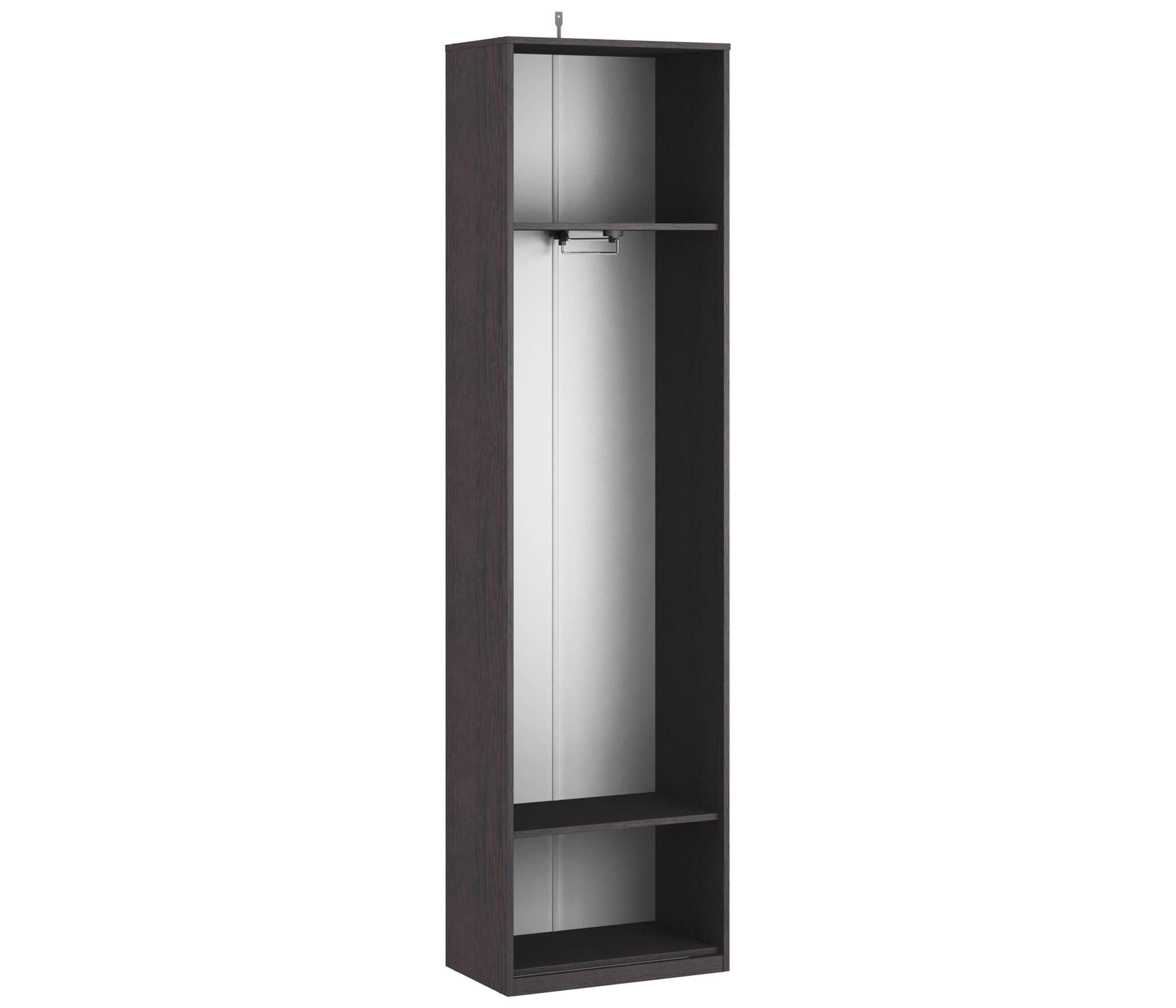 Шкаф довольно компактный с габаритными размерами ширина 59 см, высота 222 см и глубина 35 см, имеет вместительное плательное отделение со штангой, антресоль сверху, предназначенной для хранения одежды, и нижнее отделение для хранения обуви.