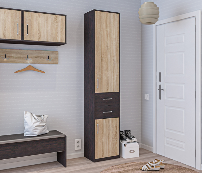При скромных габаритных размерах – ширина 45 см, высота 222 см и глубина 35 см, шкаф справится с вопросом, связанным с хранением вещей. Визуально шкаф делится на три отделения. Верхнее и нижнее под непрозрачными дверцами, оборудованы вместительными полками. В центре расположены два вместительных выдвижных ящика. Выполнен шкаф из КДСП. Корпус облицован декоративной плёнкой цвете «Венге», отделка фасадов шкафчиков в цвете «Дуб Сонома», фасадов ящиков - в цвете «Венге»