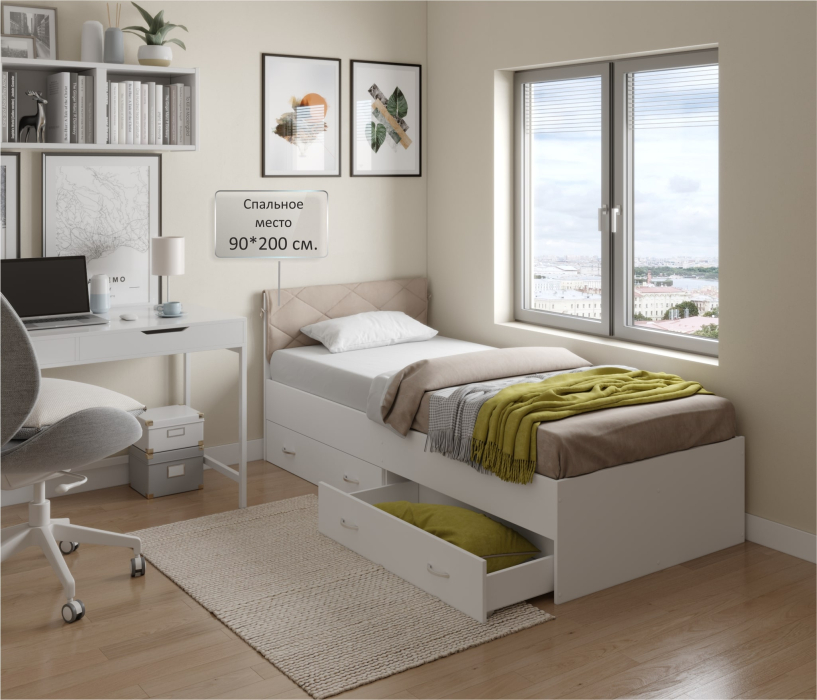 Односпальная кровать «Виктория-П» 900 мм. с мягким изголовьем и 2-мя выдвижными ящиками— прекрасный вариант кровати для сна и отдыха. Выпускается в белом цвете. Белый цвет - прекрасная база для создания интерьерного решения любого цвета. Белая мебель придает воздушность и чистоту интерьеру.