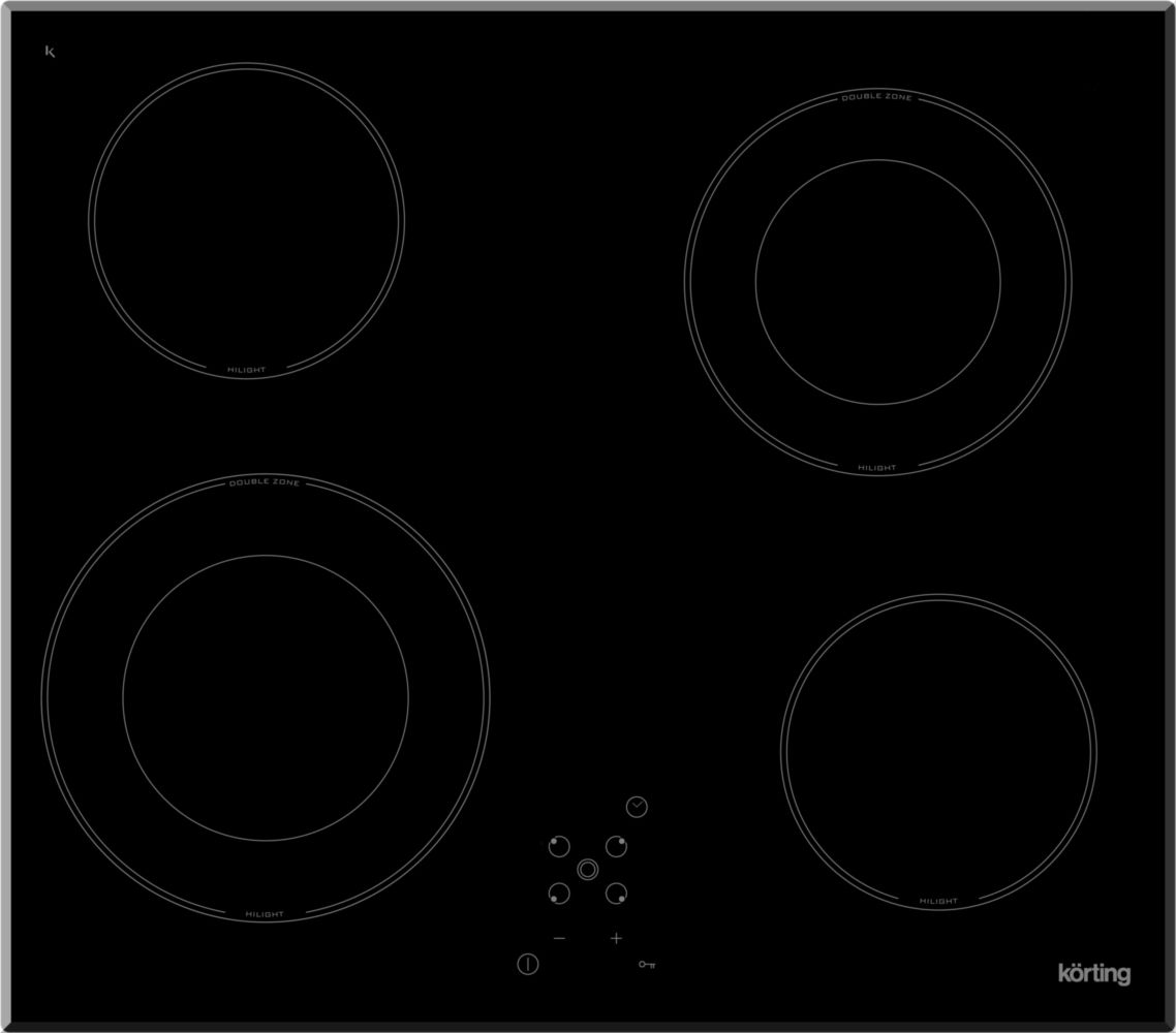 Электрические поверхности Hilight. Стеклокерамика, ширина 60см, сенсорное управление Touch, 4 зоны нагрева, 2 конфорки с круглой двойной зоной расширения, таймер, цифровая индикация режимов нагрева, индикация остаточного тепла, автоматическое отключение, функция "Защита детей", дизайн рамки- скошенные края.