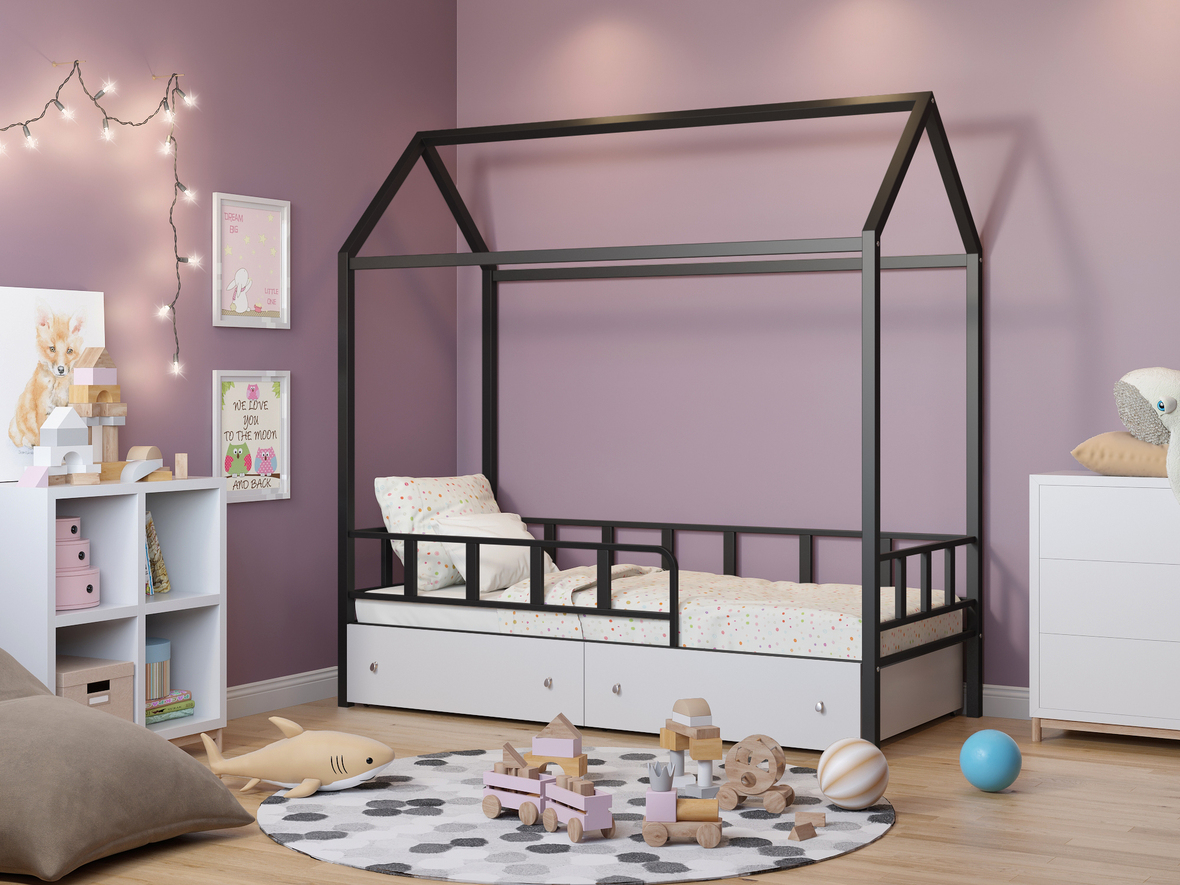 Детская кровать-домик Риччи, сделана из надежного металлического профиля толщиной 1,5 мм, покрыта безопасной не имеющей запаха порошковой краской. Основание сварное из металлических ламелий, выдержит нагрузку до 150 кг. Размер спального места 90х190 см. Большой выбор цветовых исполнений: белый, черный, слоновая кость, коричневый, голубой, розовый, зеленый, оранжевый, желтый. Дополнительно может быть укомплектована выдвижными ящиками для белья и игрушек. Ящики на колесиках, сделаны из ЛДСП 16 мм, цвет белый, дуб молочный, венге.