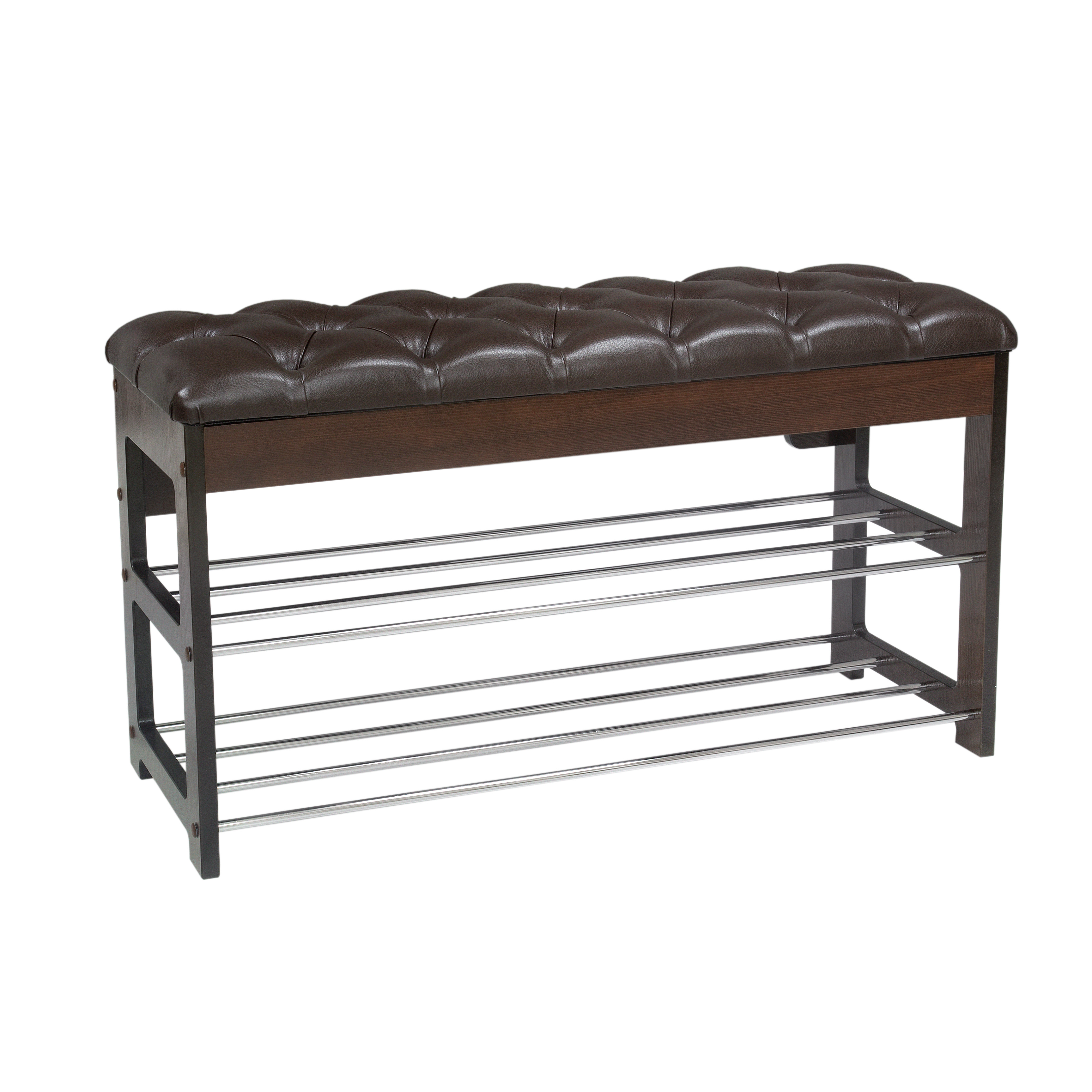 Широкая двухместная банкетка с мягким сиденьем и полкой для обуви. Она сделана в незамысловатом дизайне и органично впишется в любой интерьер.
