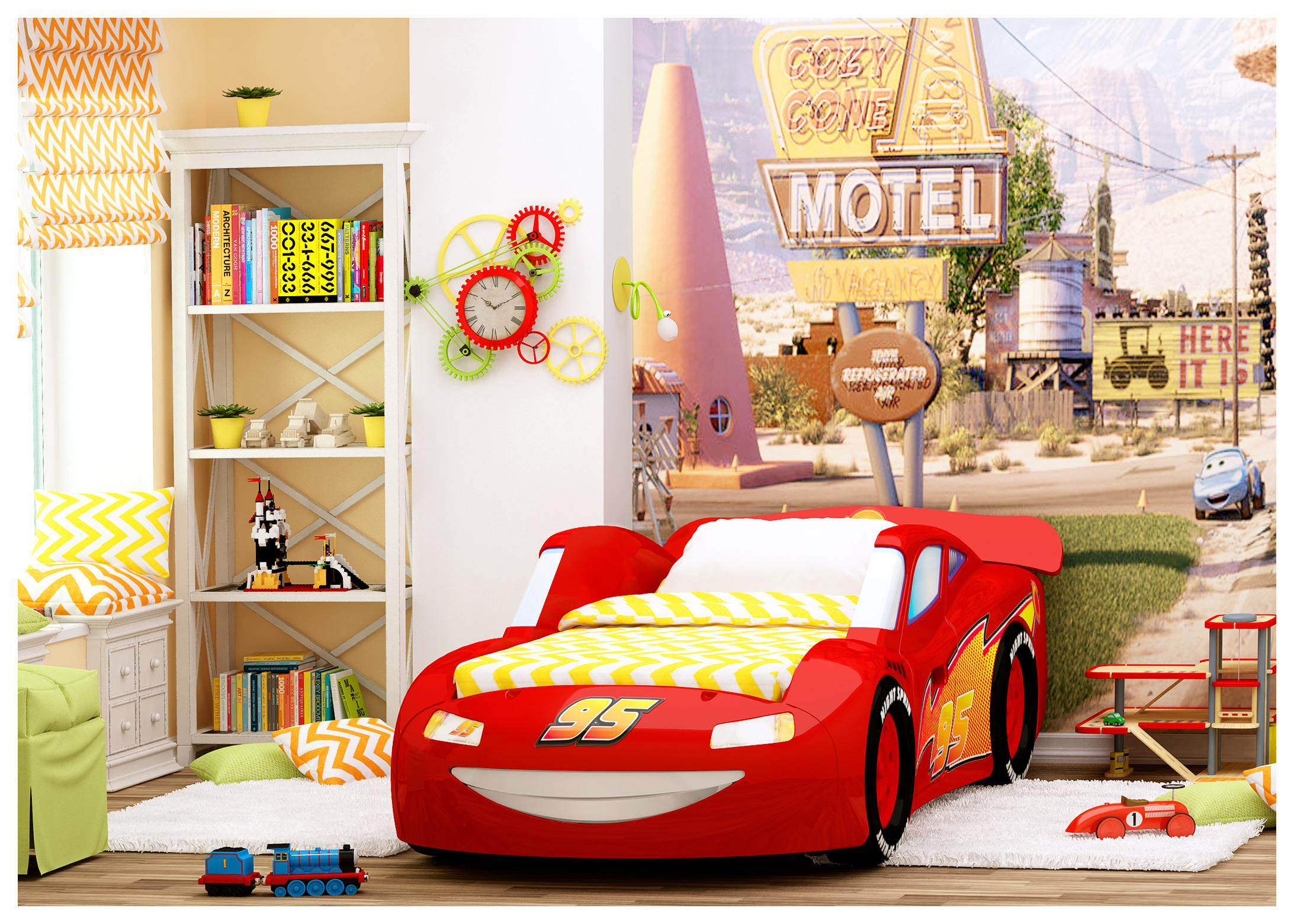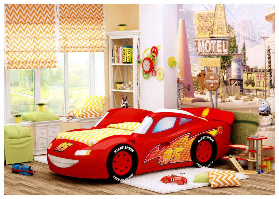 Спальное место 1700 на 700 мм.Кровать произведена из даропрочного полистирола. Имеет ящик для белья, который открывается под спальным местом, благодаря подъемным механизмам. Светящиеся передние фары включаются с помощью кнопки, которая питается от блока питания на 12 V.Ламинированная фотопечать.