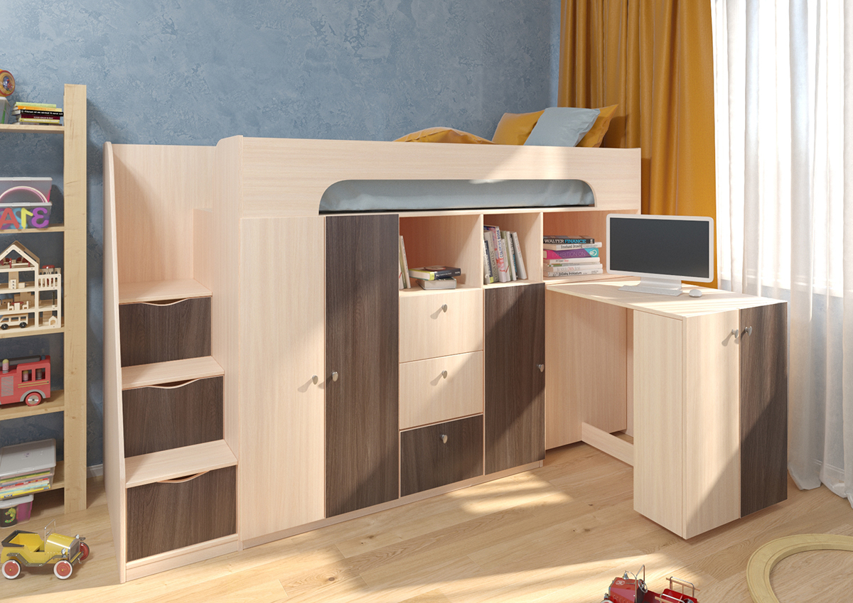 Кровать-чердак Астра 11 - отличный способ сэкономить место в комнате. Кровать обладает полноценным спальным местом и в то же время вмещает в себе массу отделения для хранения одежды и вещей. Так же предусмотрена рабочая поверхность, которая может быть убрана после занятий.