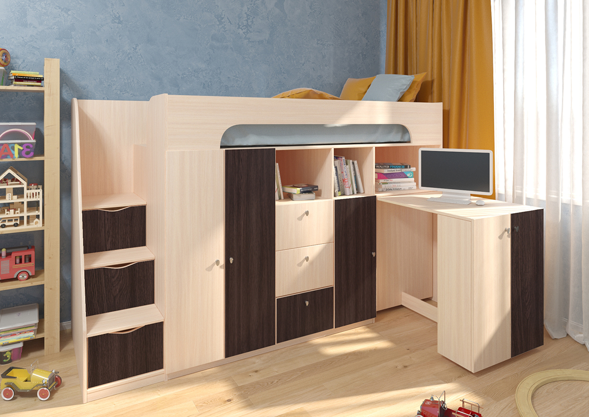 Кровать-чердак Астра 11 - отличный способ сэкономить место в комнате. Кровать обладает полноценным спальным местом и в то же время вмещает в себе массу отделения для хранения одежды и вещей. Так же предусмотрена рабочая поверхность, которая может быть убрана после занятий.