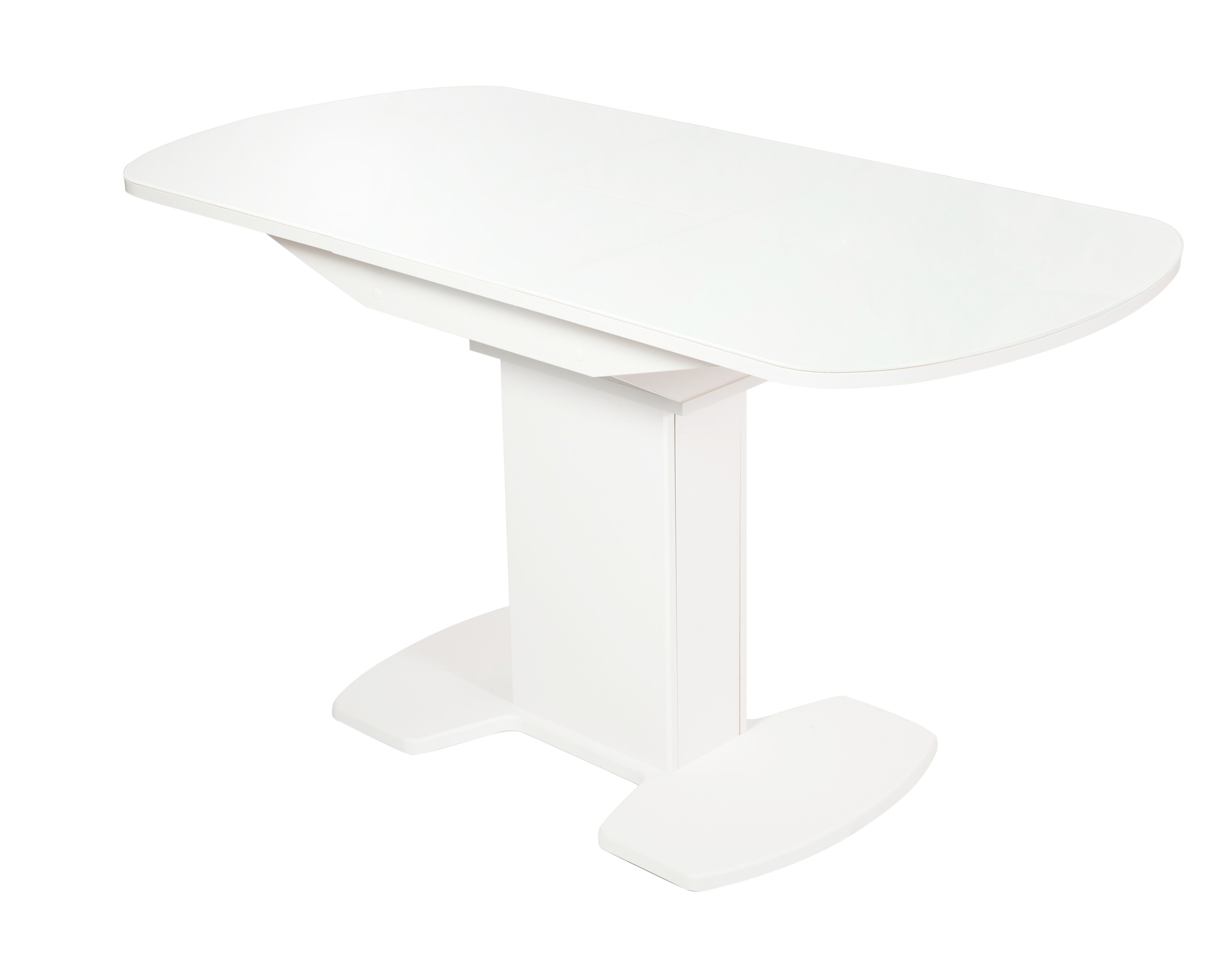 Раскладной обеденный стол со стеклянной столешницей. Основание выполнено из МДФ, обтянуто пленкой ПВХ белого цвета. Столешница - плита МДФ (22мм) покрыта закаленным стеклом (4мм). Синхронный механизм раскладывания и вставка-бабочка позволяют увеличить длину столешницы на 31,5 см. Габаритные размеры (см): Длина: 110/141,5; Ширина: 70; Высота: 74,2
