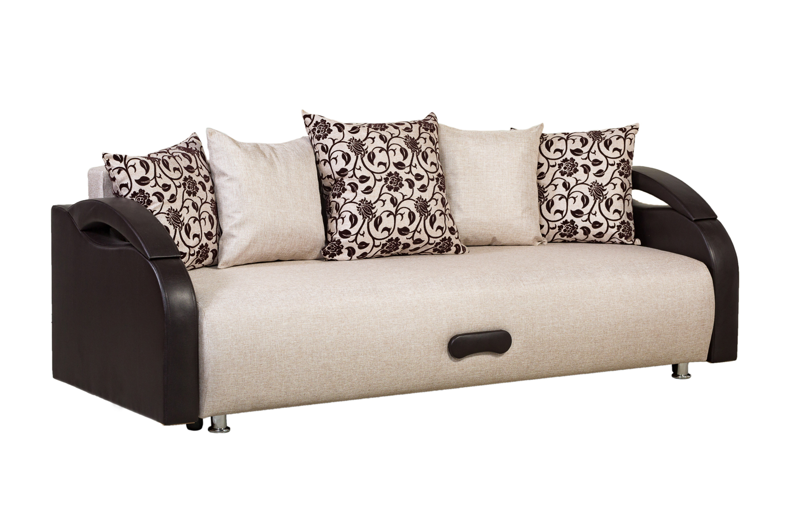 Тип тканей – шенилл, жаккард, замша. Отлично подойдет даже для самой небольшой комнаты, в том числе как постоянное спальное место. Наполнение – пенополиуретан, материал каркаса – дерево хвойных пород, ЛДСП, ДВП. Для удобства транспортировки и заноса в квартиру диван разбирается на части, которые упаковываются в полиэтиленовую пленку.