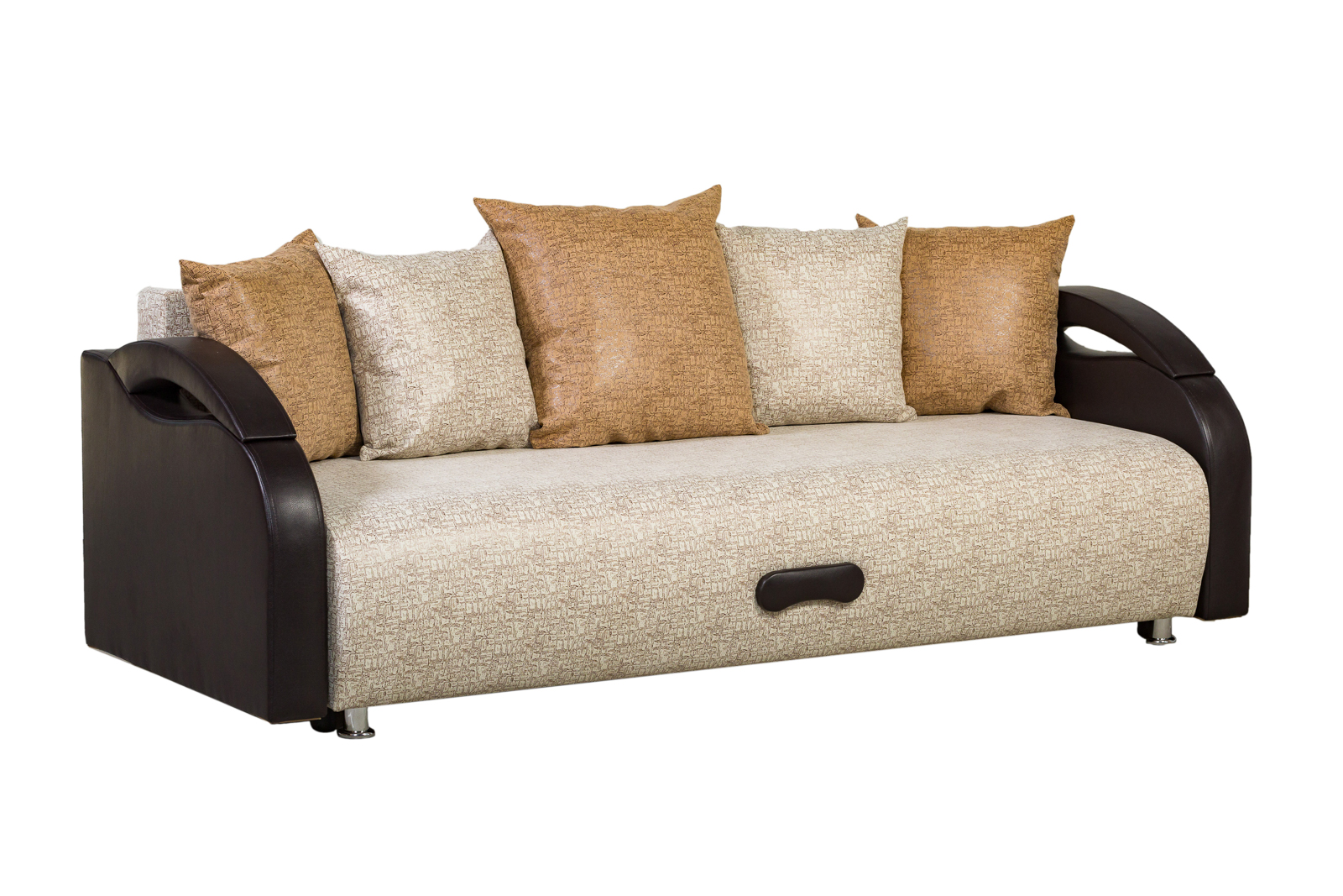 Стильный диван-еврокнижка Юпитер БД с практичными подлокотниками интересной формы из искуственной кожи. Благодаря простому и надежному механизму «Еврокнижка» диван легко превращается в удобное спальное место для двух человек размером 1930 х 1400 мм. Диван имеет ящик для вещей, удобную ручку для раскладывания. Пять подушек входят в стоимость дивана. Сидение мягкое, благодаря наполнителю ППУ, конструкция прочная и надежная, отлично зарекомендовавшая себя.