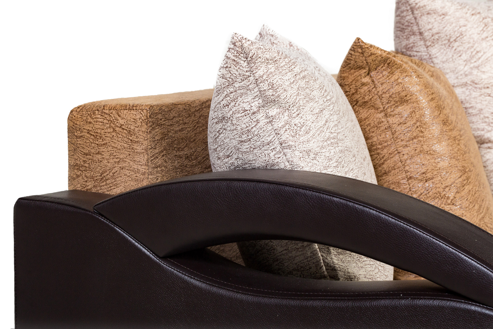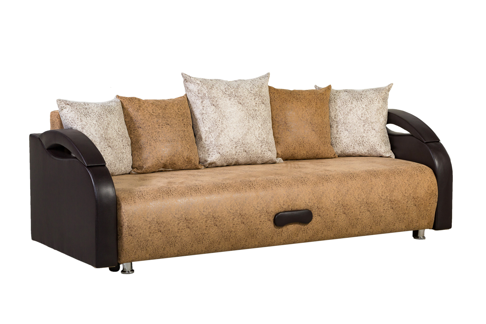 Тип тканей – шенилл, жаккард, замша. Отлично подойдет даже для самой небольшой комнаты, в том числе как постоянное спальное место. Наполнение – пенополиуретан, материал каркаса – дерево хвойных пород, ЛДСП, ДВП. Для удобства транспортировки и заноса в квартиру диван разбирается на части, которые упаковываются в полиэтиленовую пленку.