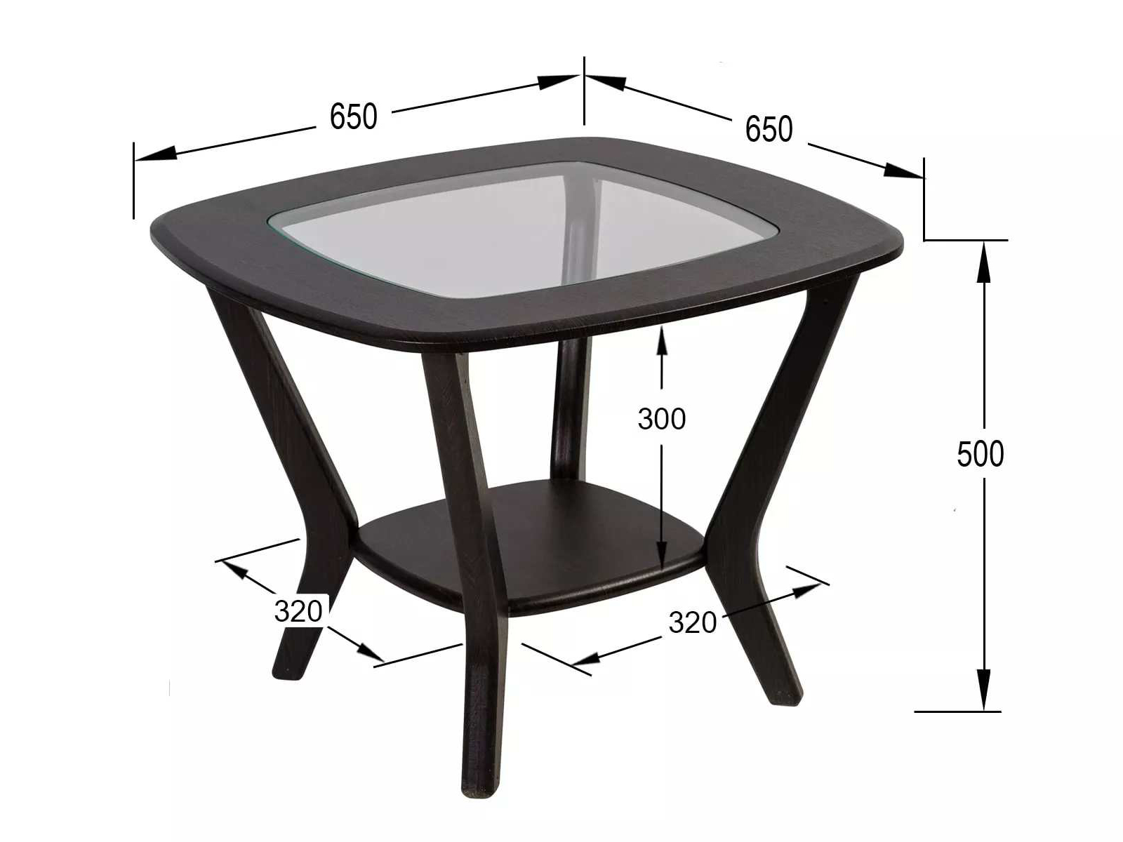 Столик имеет компактные размеры: длина 650 мм, ширина 650 мм, высота 500 мм.